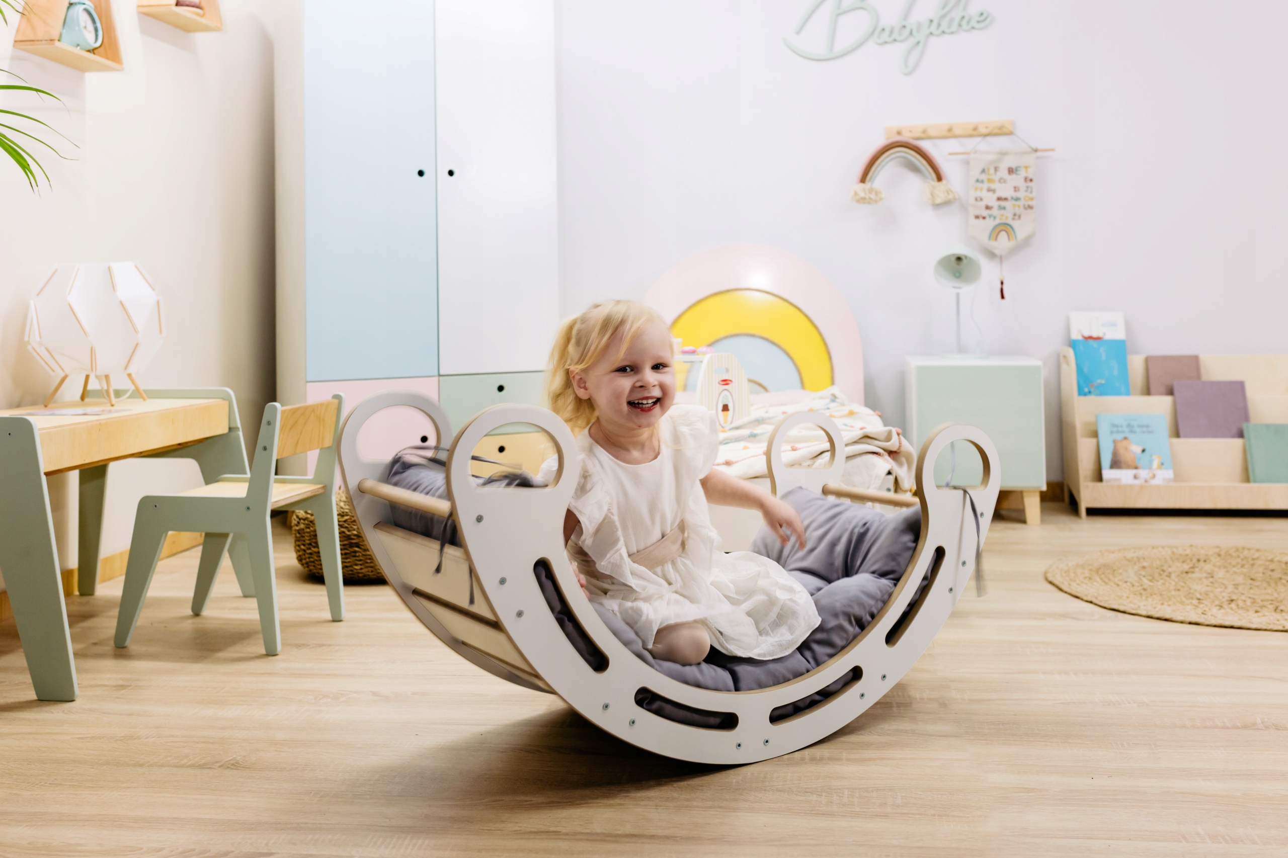 Гойдалка використовується для гри в рівновагу та сприяє розвитку моторики дитини. Це процес, який має вирішальне значення для навчання читання та письма, розвитку просторової орієнтації та зорово-моторної координації.
