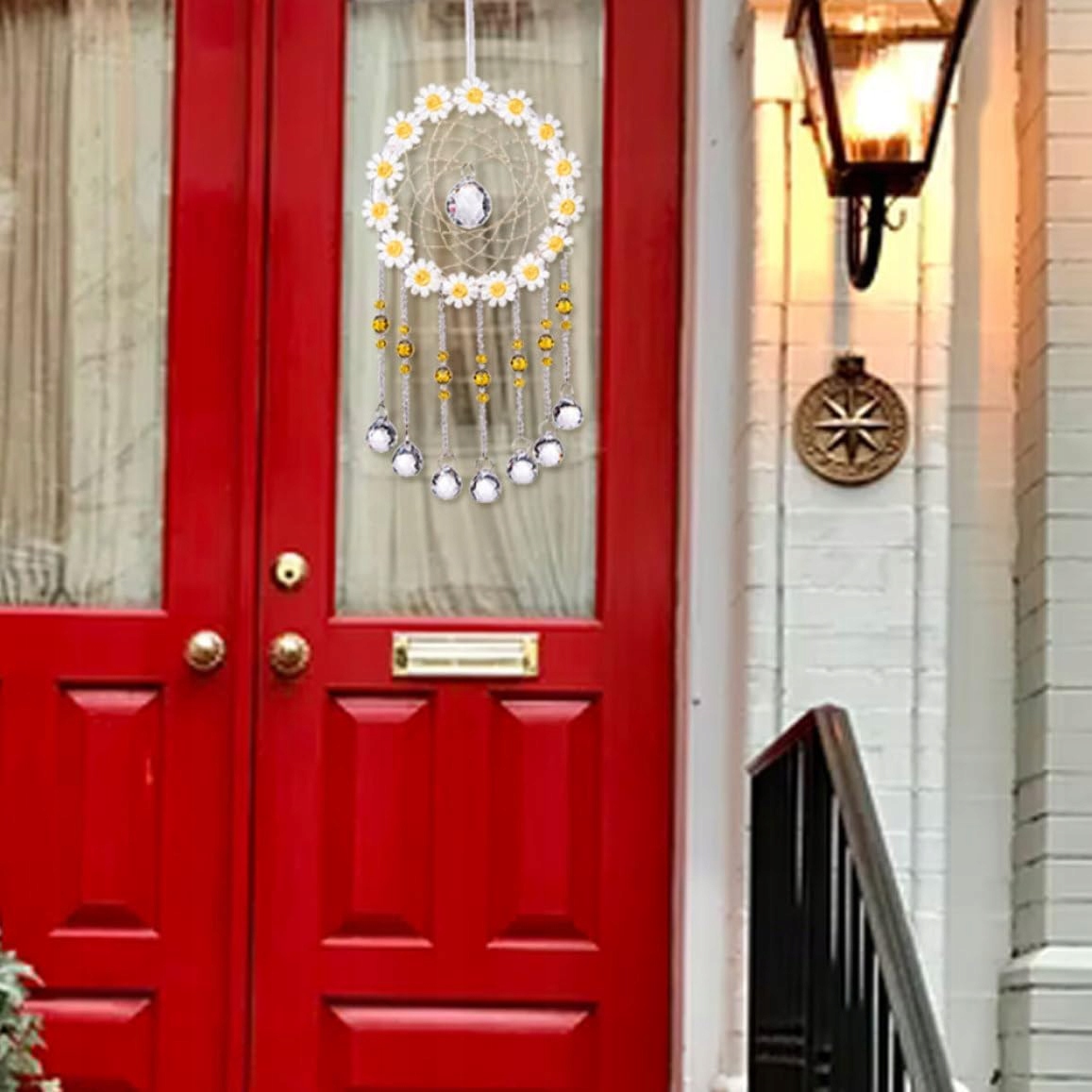 Особливий дизайн: кришталевий ловець сонця прикрашений прозорими та жовтими пластиковими намистинами різного розміру та жовтими квітами, дуже привабливими.
