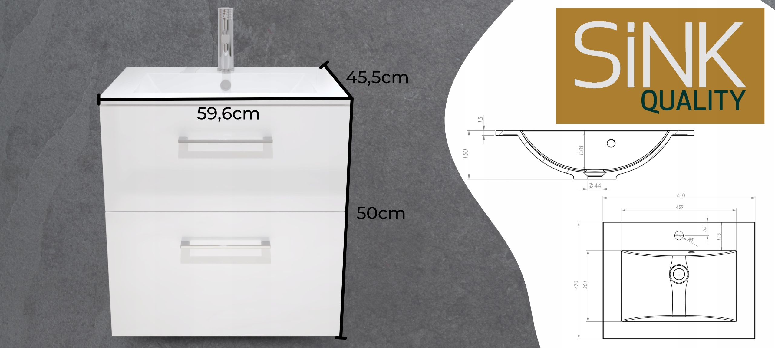 ШАФКА ПІДВІСНА БІЛА для ВАННОЇ з УМИВАЛЬНИКОМ 60 см, комплект 2 ЯЩИКИ, глянцевий