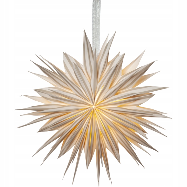 Чарівна зірка діаметром 60 см - унікальна прикраса, яка приваблює погляд чітко сформованими краями та елегантним поєднанням білого з ніжними бежевими смугами. Виготовлений із трьох шарів паперу, він випромінює легкість і тонкість, ідеально вписуючись у різдвяні та зимові композиції. У комплект входить елегантна стрічка, яка дозволяє легко повісити прикрасу на вікно, над столом або на стіну. Продукт сертифікований FSC®, що підтверджує його екологічне походження. Для підсвічування зірки необхідно придбати кабель і джерело світла - вони не входять в комплект.