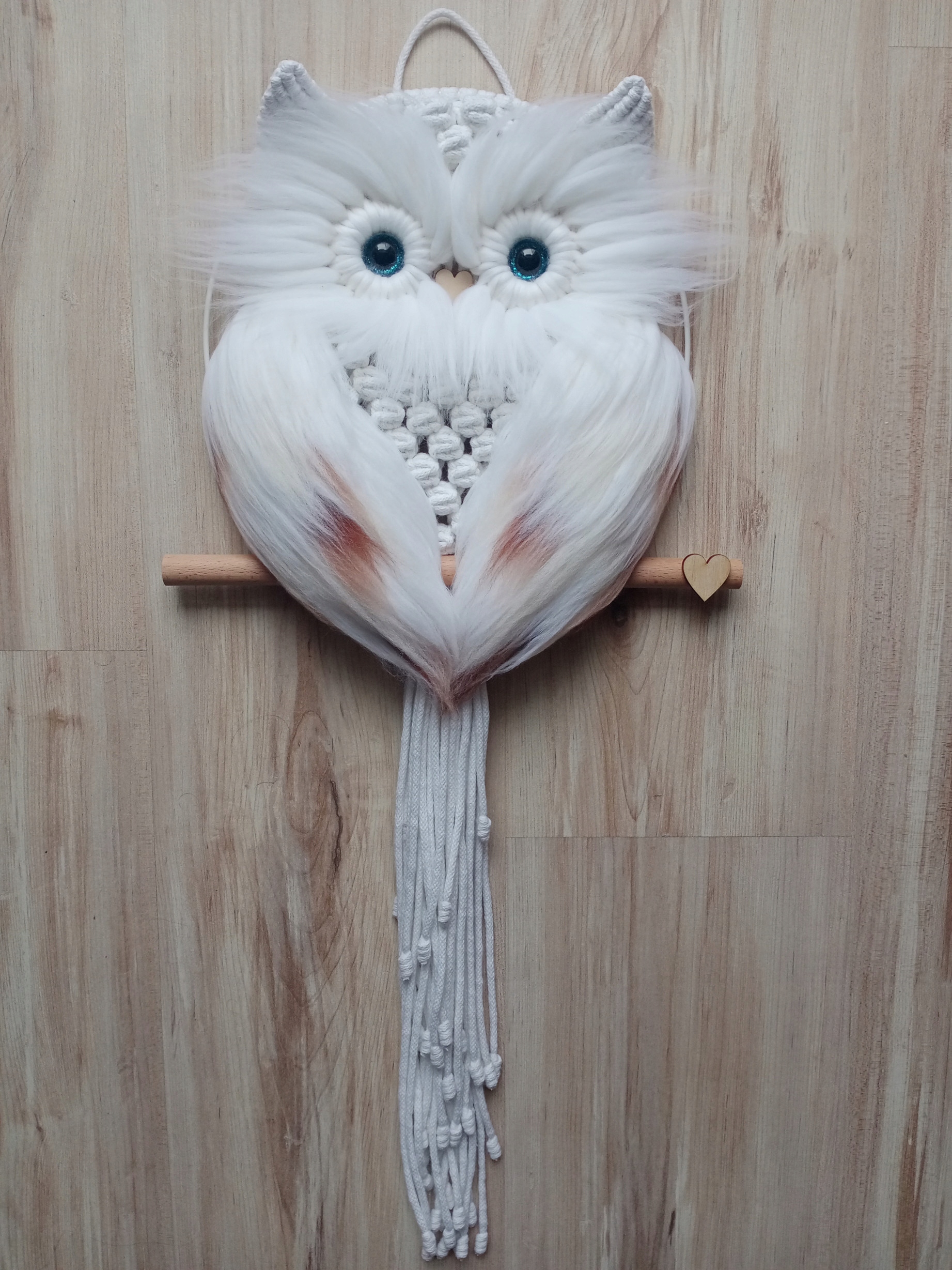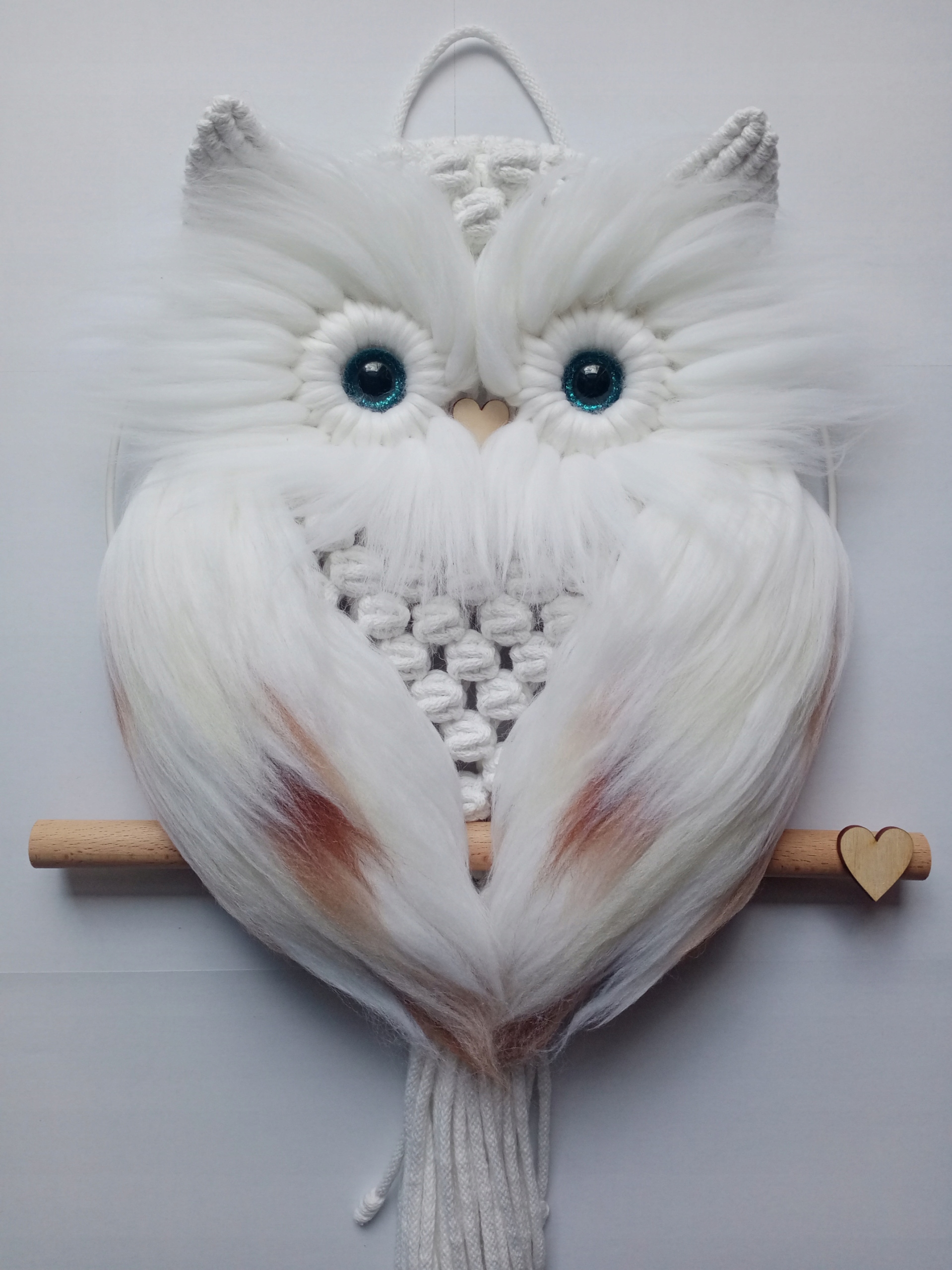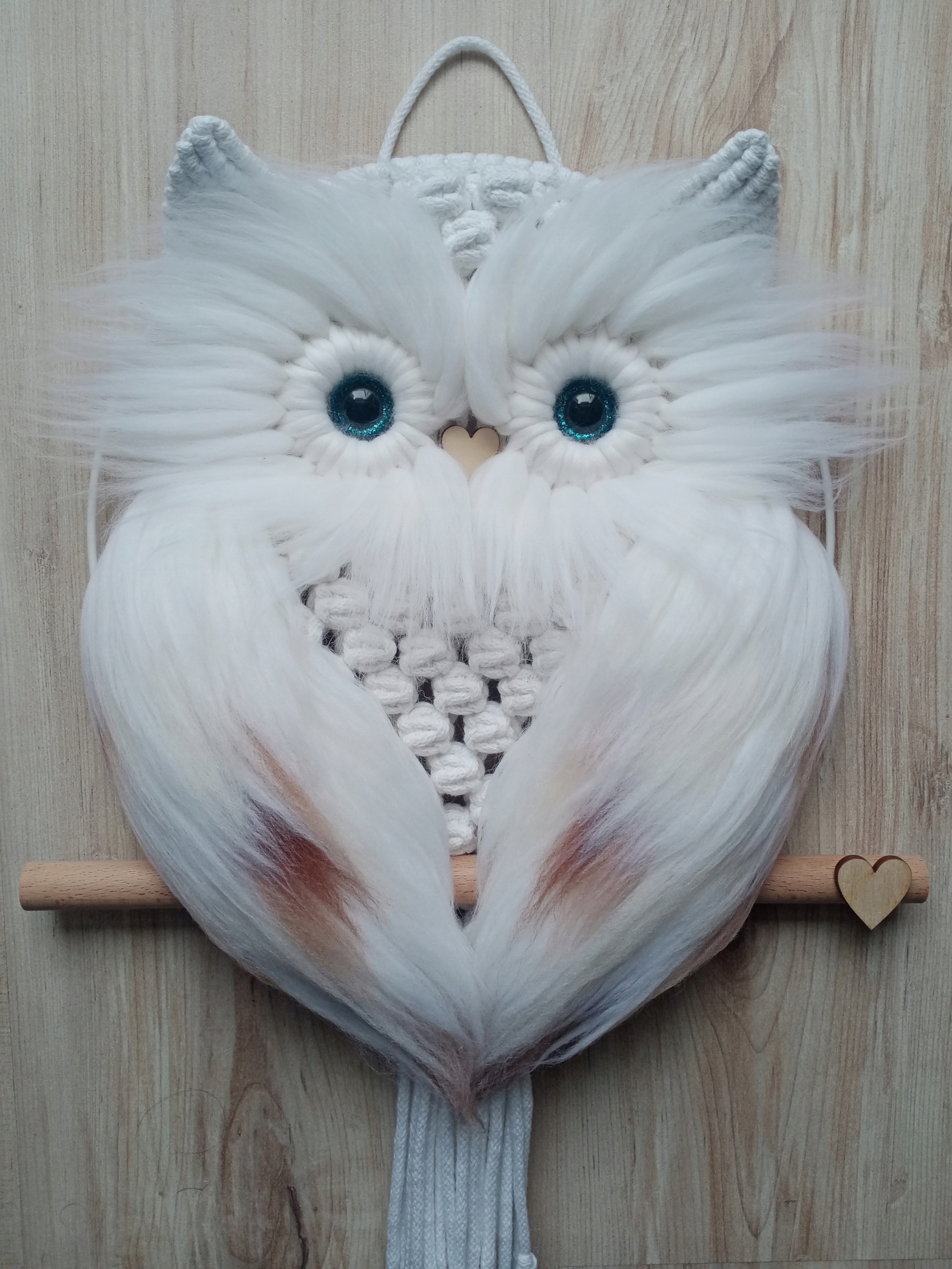 Сова 100% ручної роботи в Польща, з Китаю не привезена. Струни від польського виробника струн. Через ручну роботу можливі невеликі відмінності в розмірах і плетінні. Відтінок струни та вовни на фотографіях може дещо відрізнятися від оригіналу - це пов'язано з налаштуваннями монітора.
