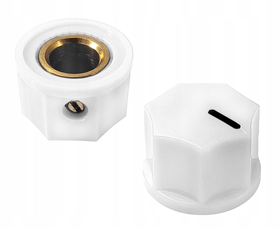 діаметр біля основи: 15 мм діаметр ручки: 12,9 мм висота: 10 мм Діаметр осі: 6,4 мм, фіксується гвинтом матеріал: бакеліт колір ручки: білий з білим індикатором Ручка 10,5х15 мм, діаметр осі 6,35 мм, білий з буртом, мідь + бакеліт