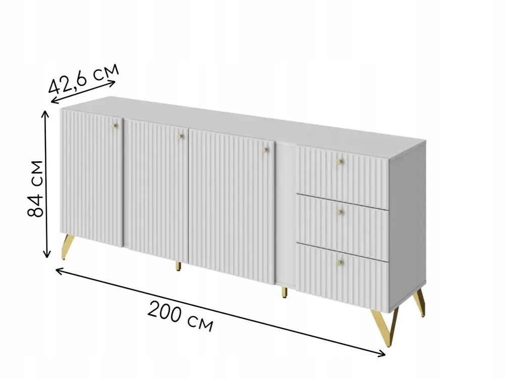 Універсальний білий колір дозволяє комод вписати в будь-який інтер'єр. Три місткі секції за дверцятами на петлях і три висувних ящика забезпечують максимальну місткість. Петлі з плавним закриванням забезпечують безшумне закривання. Приховані монтажні напрямні з плавним закриванням естетичні та безшумні. Регульовані ніжки дозволяють ідеально вирівняти меблі. Фасади МДФ екологічні. Фрезерування спереду додає краси та сучасності. Висота ніжок 150 мм, що полегшує прибирання під комодом.