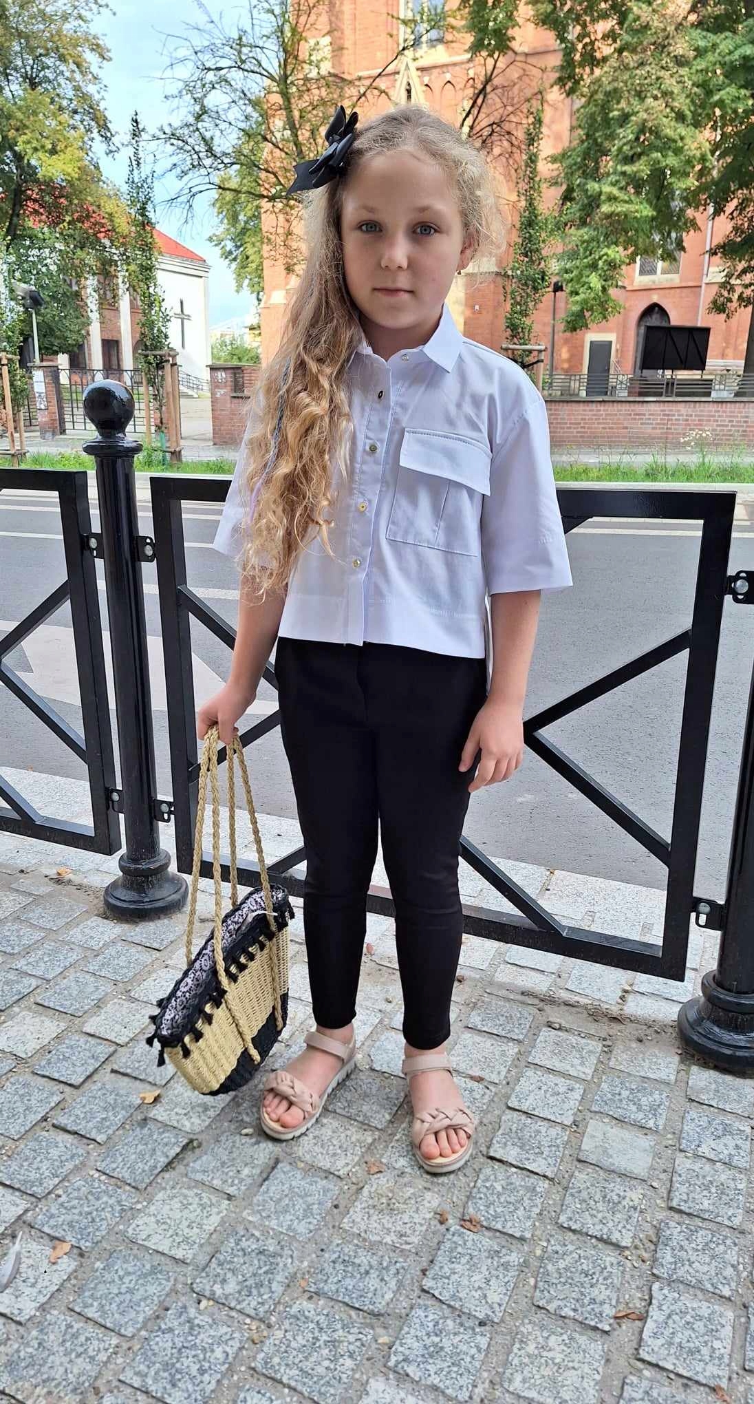 Біла сорочка з короткими рукавами для дівчаток поєднує в собі елегантність і функціональність. Виготовлений з легкого та повітряного матеріалу, ідеально підходить для теплих днів. Сорочка має тонку кишеню на грудях, що додає їй шарму та практичності. Спинка сорочки трохи довша за перед, що надає їй сучасний, модний вигляд і забезпечує додатковий комфорт. Застібається на кнопки, що дозволяє легко одягати і знімати. Завдяки простому, але стильному крою, сорочка ідеально підходить як для повсякденних, так і для більш урочистих випадків.