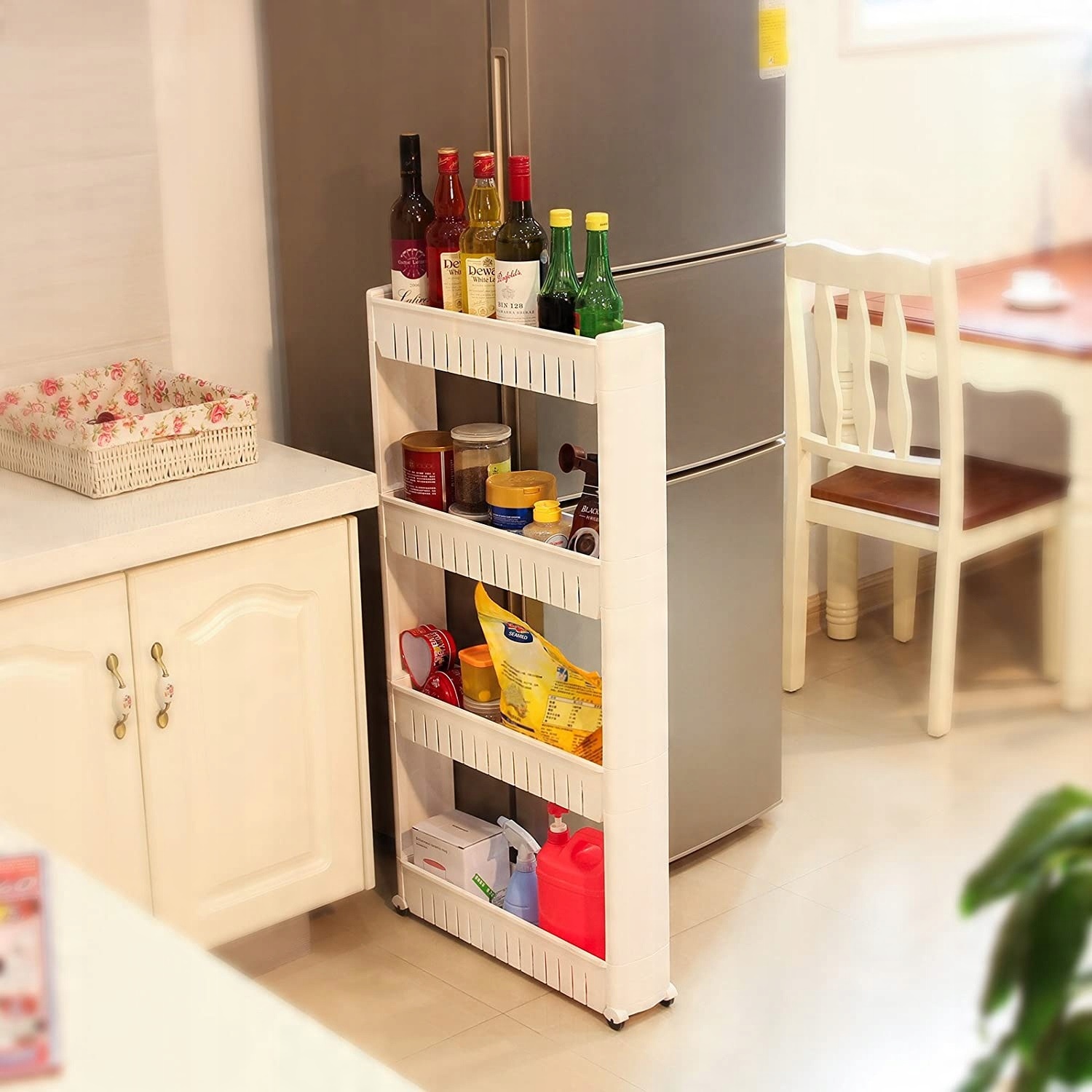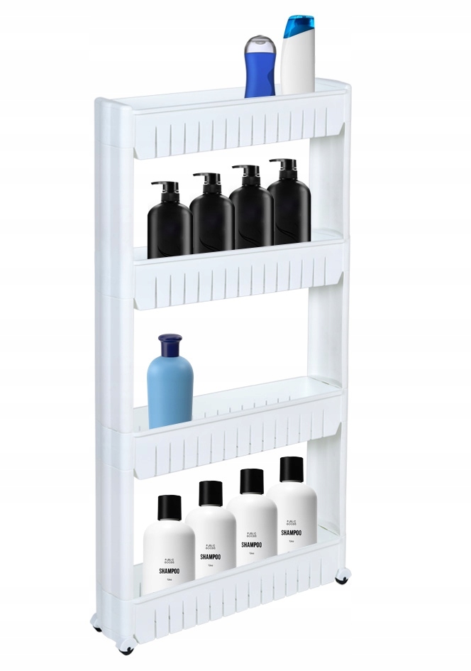 Біла полиця розроблена для використання вузьких просторів, наприклад, між холодильником і шафою або між пральною машиною та шафою. Полиця має 4 глибокі полиці що дозволить вам зберігати багато речей, наприклад, кухонне приладдя, пляшки, спеції. Він також ідеально підходить як полиця для ванної кімнати для косметики, паперу, рідин або порошків. Використання 4-х коліс дозволить легко і швидко переміщати полицю.