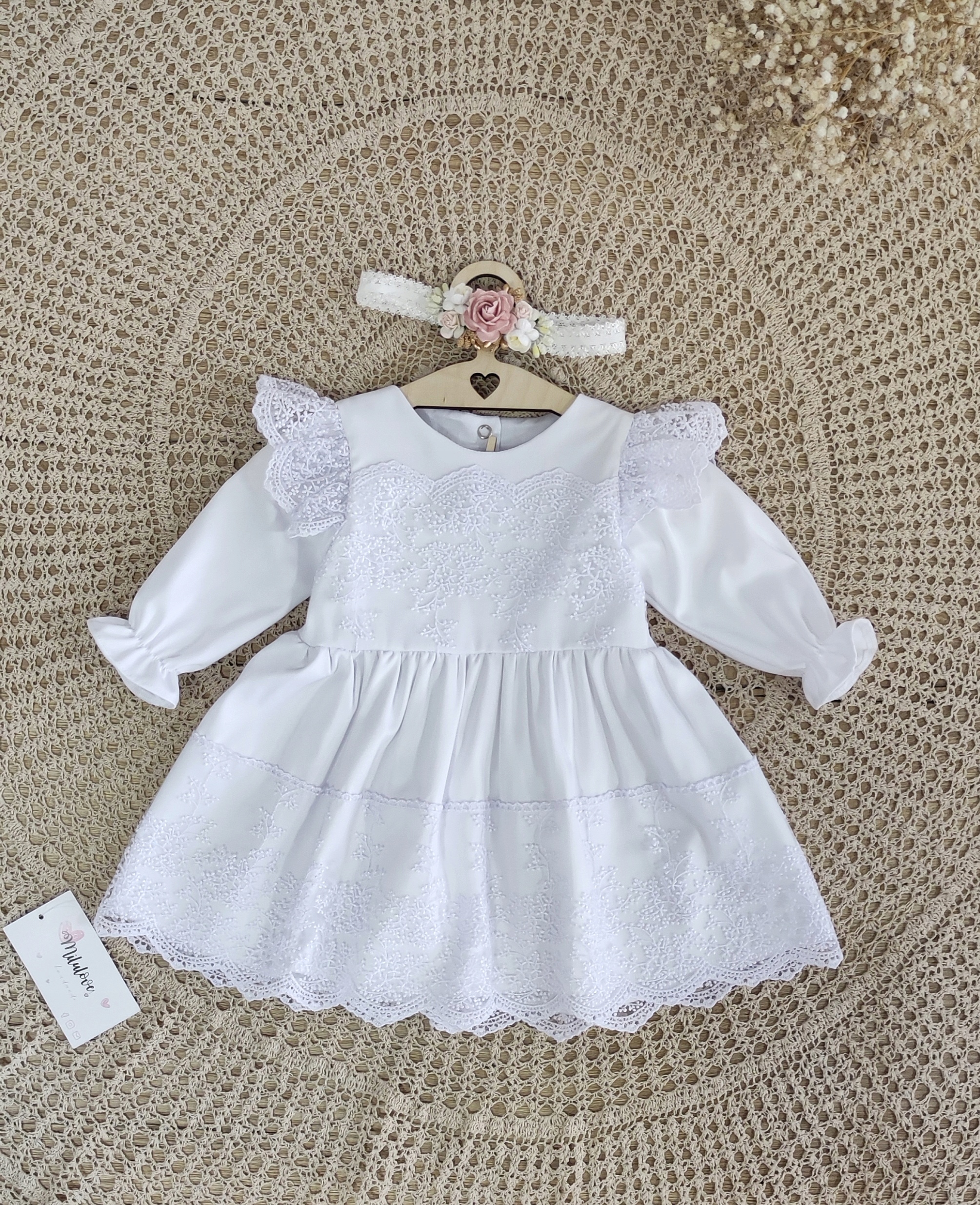 Біла сукня Іга. Виготовлена з ошатної білої тканини, оброблена білим матовим мереживом.