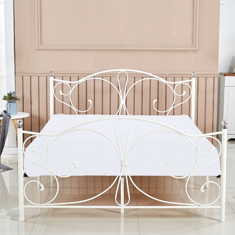 Біле металеве ліжко, прикрашене красивими візерунками.
