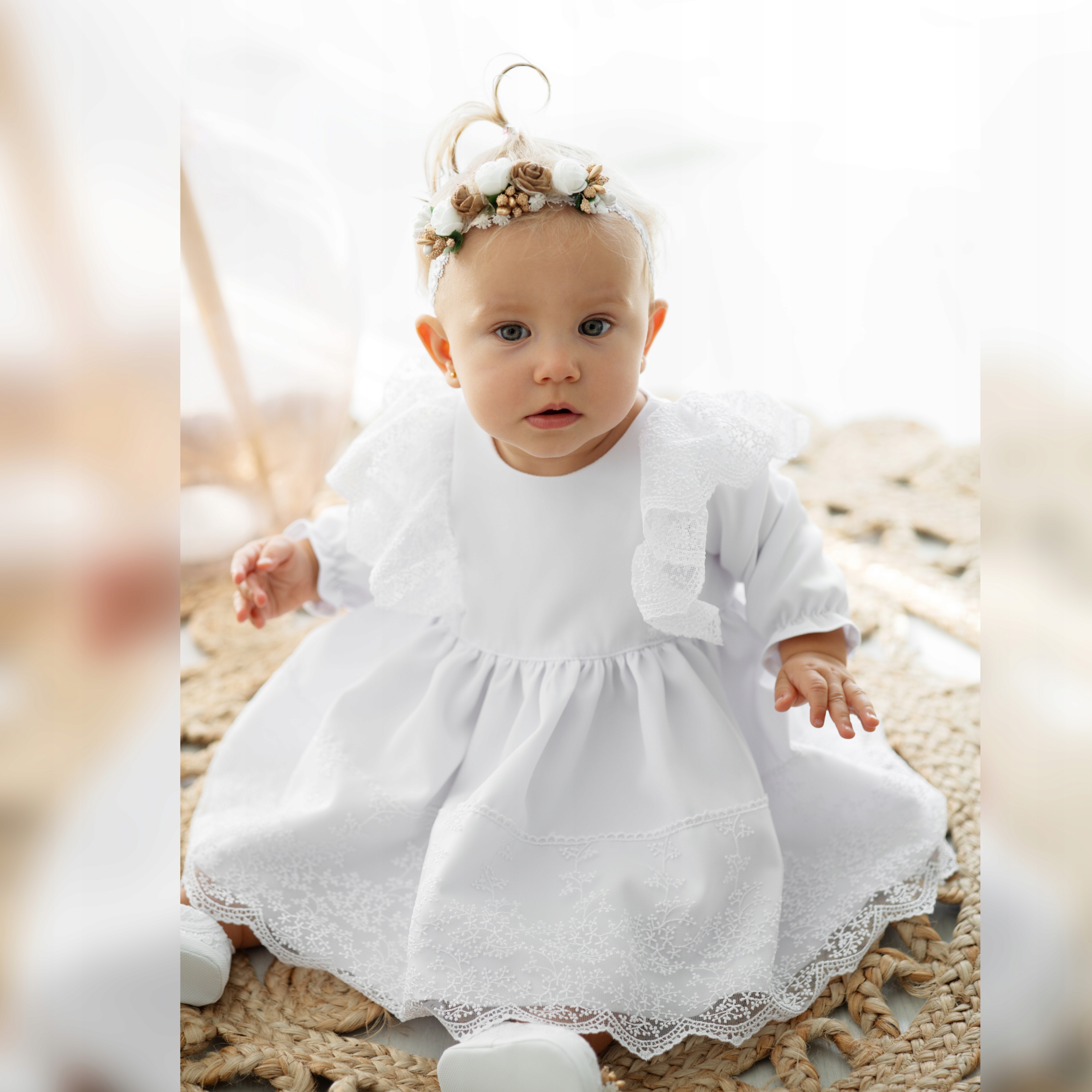 Біла сукня для хрещення Ola з елегантним мереживом і довгими рукавами була розроблена для хрещення, сімейних свят або весіль.