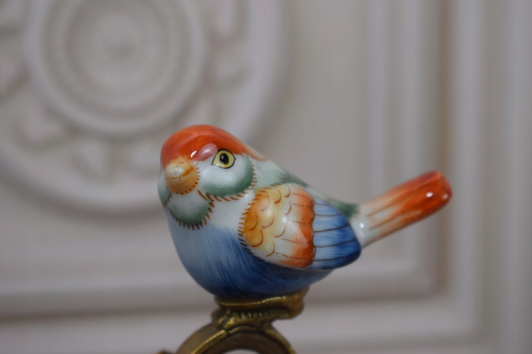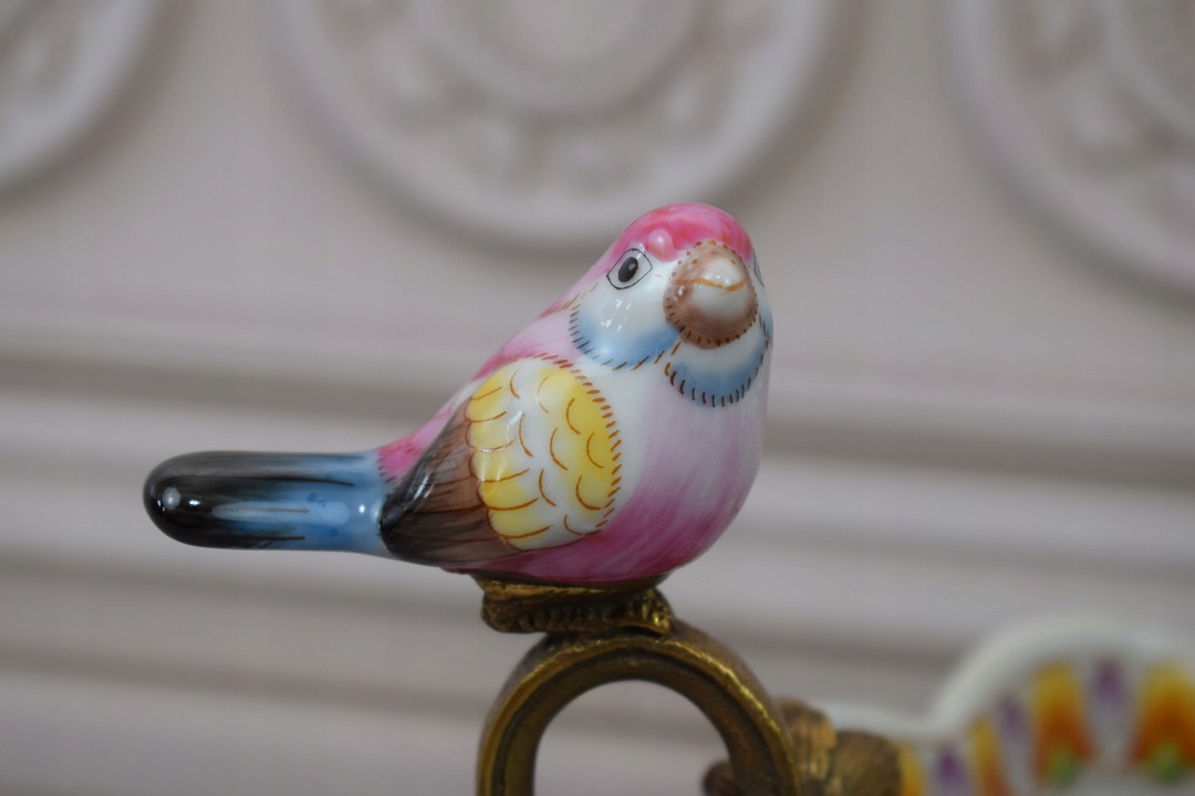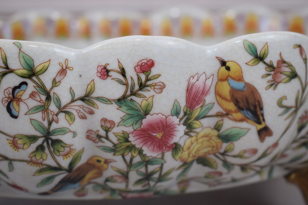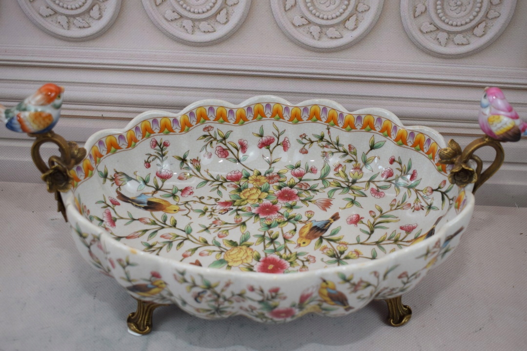 Біле порцелянове блюдо - Барвисті квіти - Птахи - Порцеляна + Бронза