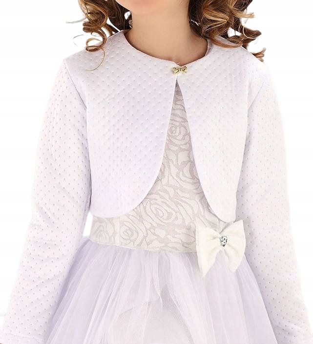 Порадуйте свою маленьку леді елегантним Білим болеро для весілля та причастя - ідеальним акцентом для її особливих випадків! Це надзвичайно ніжне болеро ніжного білого кольору підкреслить як її урочисте вбрання для причастя, так і її елегантне весільне вбрання. Виготовлений з матеріалів найвищої якості, він гарантує не тільки комфорт носіння, але й бездоганний зовнішній вигляд під час урочистої церемонії.