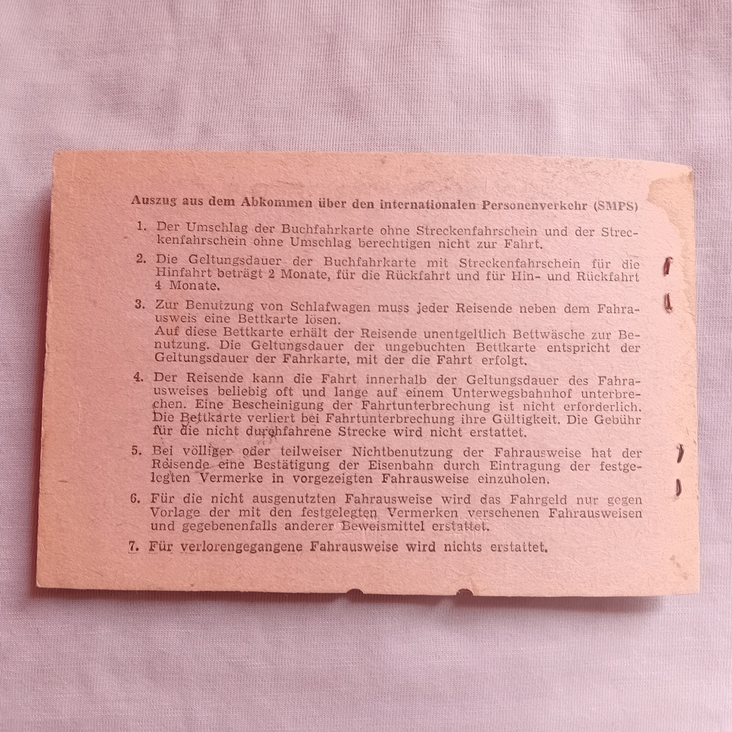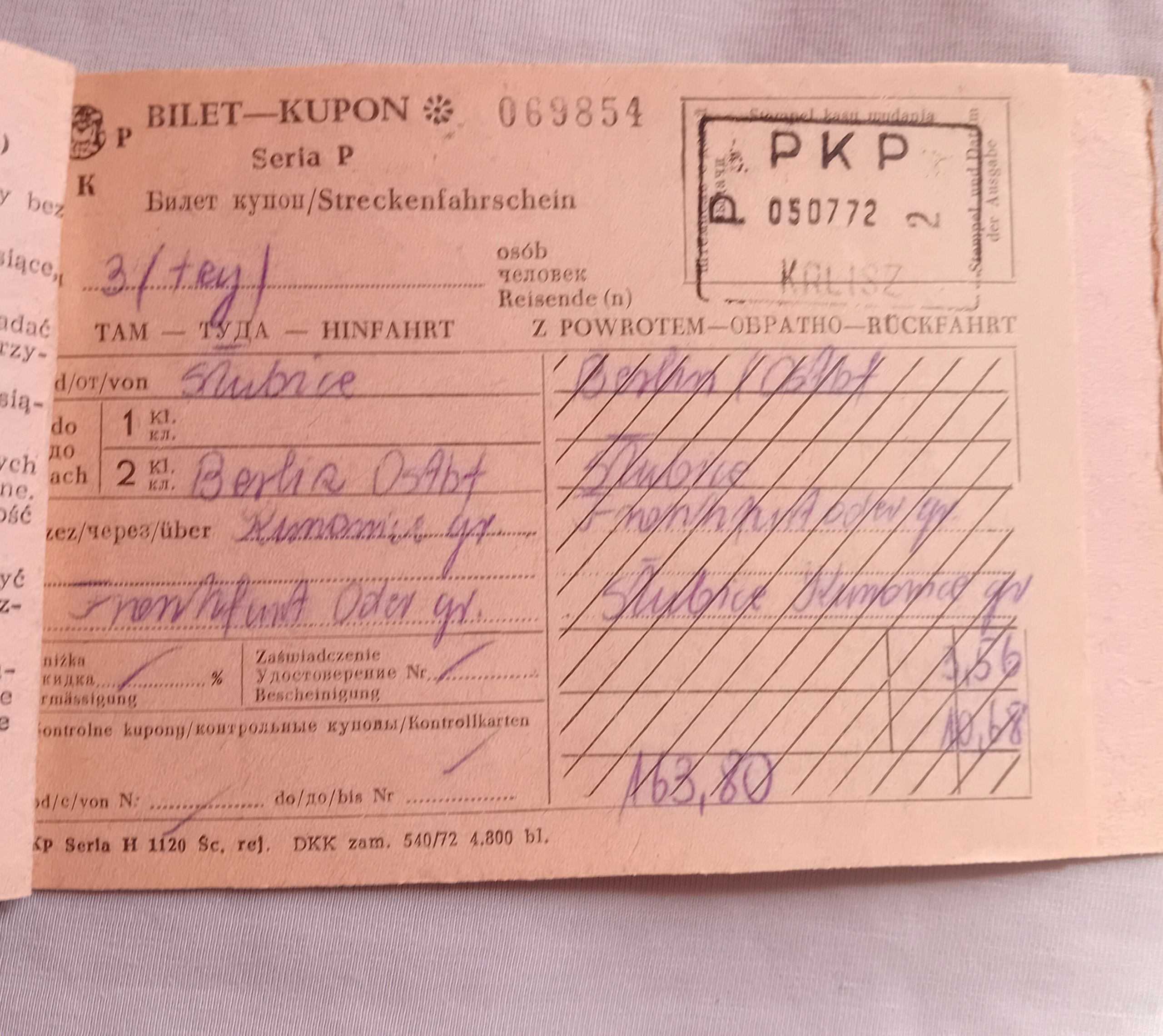 Я продам оригінальний купон на працівника ПКП - заповнену форму на маршруті Słubice -Berlin Ost- Słubice з липня 1972 року. Набір включає подвійну обкладинку та дві формули - копії. Оригінал використовувався. Розміри 15 х 10 см. Інформація польською, російською та німецькою мовою. Хороший стан. Невелике місце на краю обкладинки.