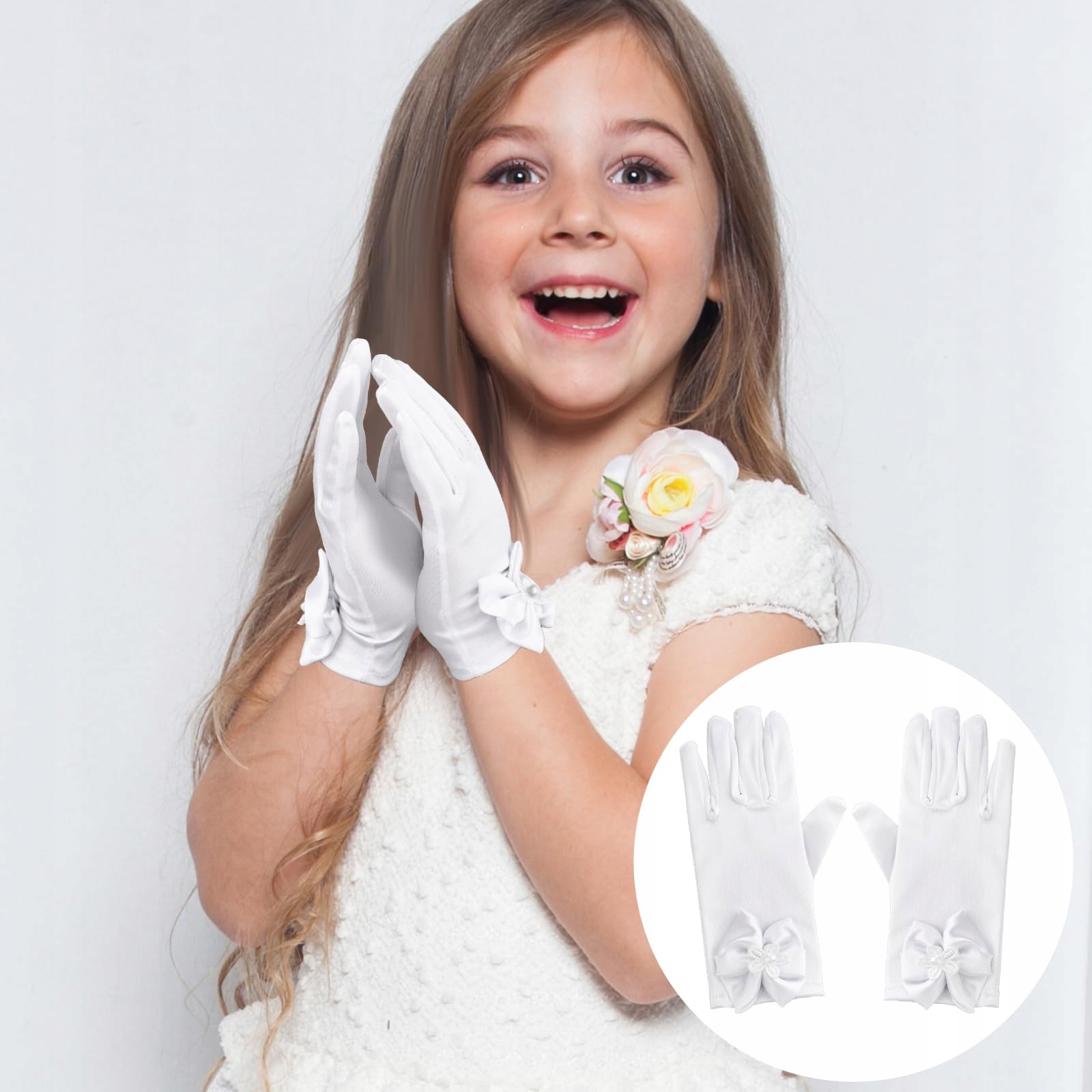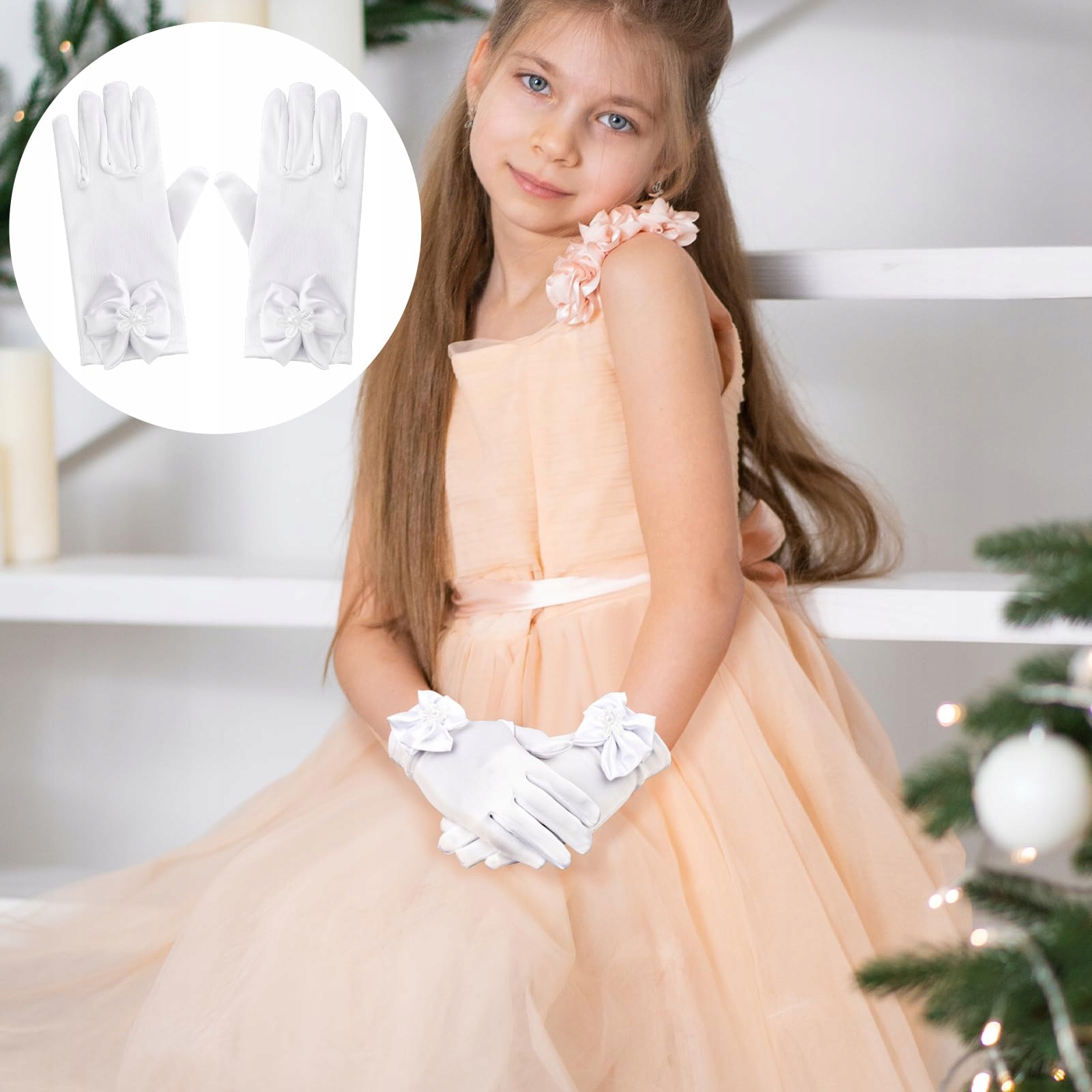 Rękawiczki Komunijne Białe Satynowe z Kokardą i Perłą I Komunia Święta