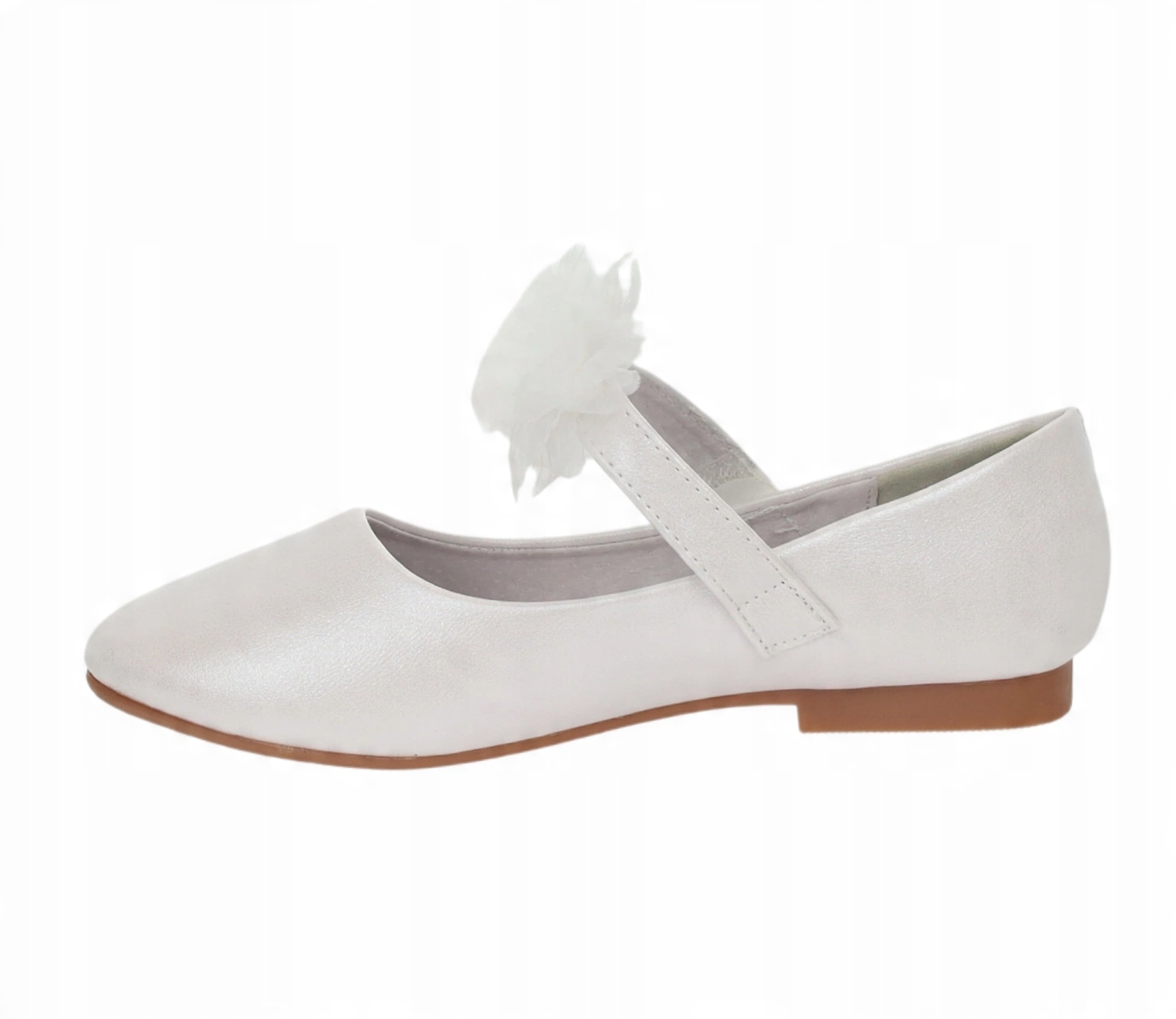 Білі дитячі насоси з ременем липучки та квіткою. Перше взуття Причастя