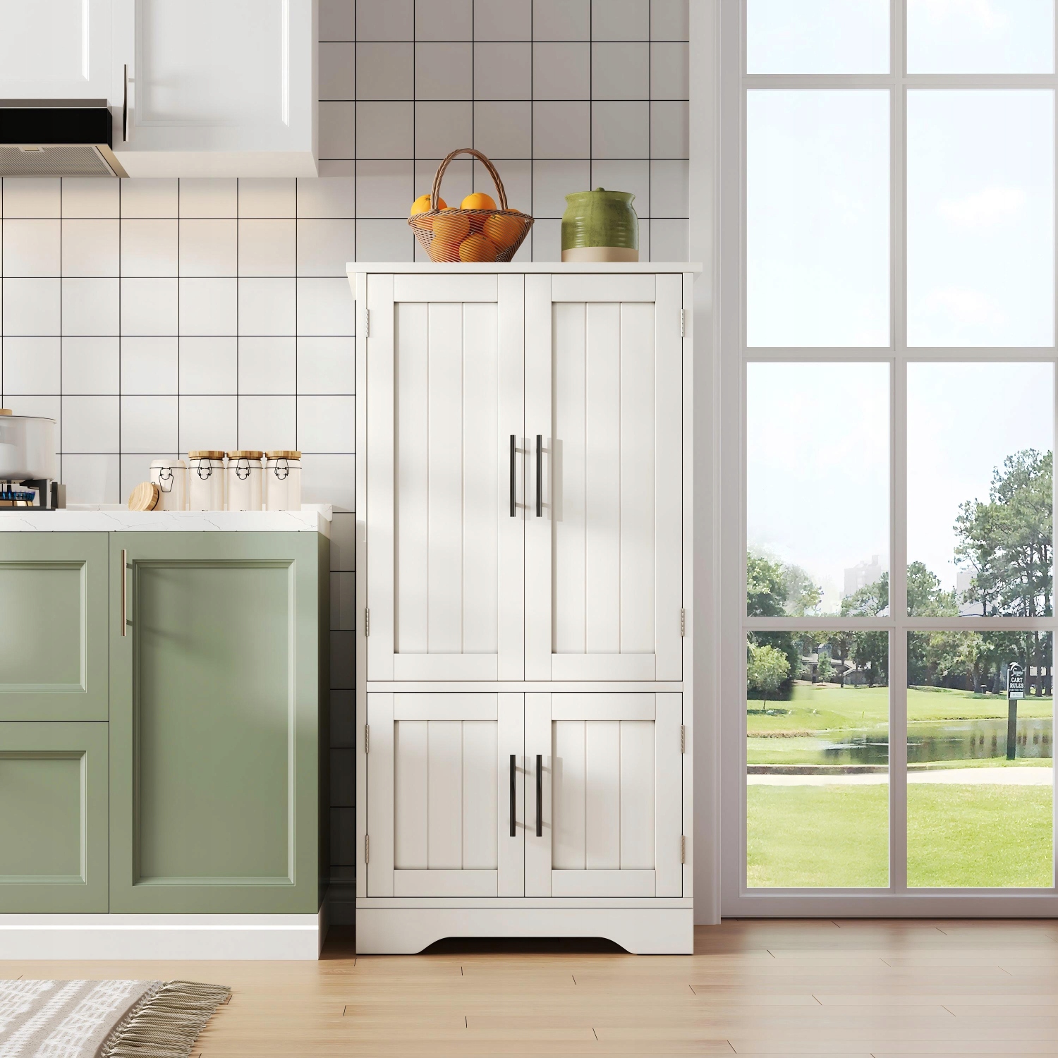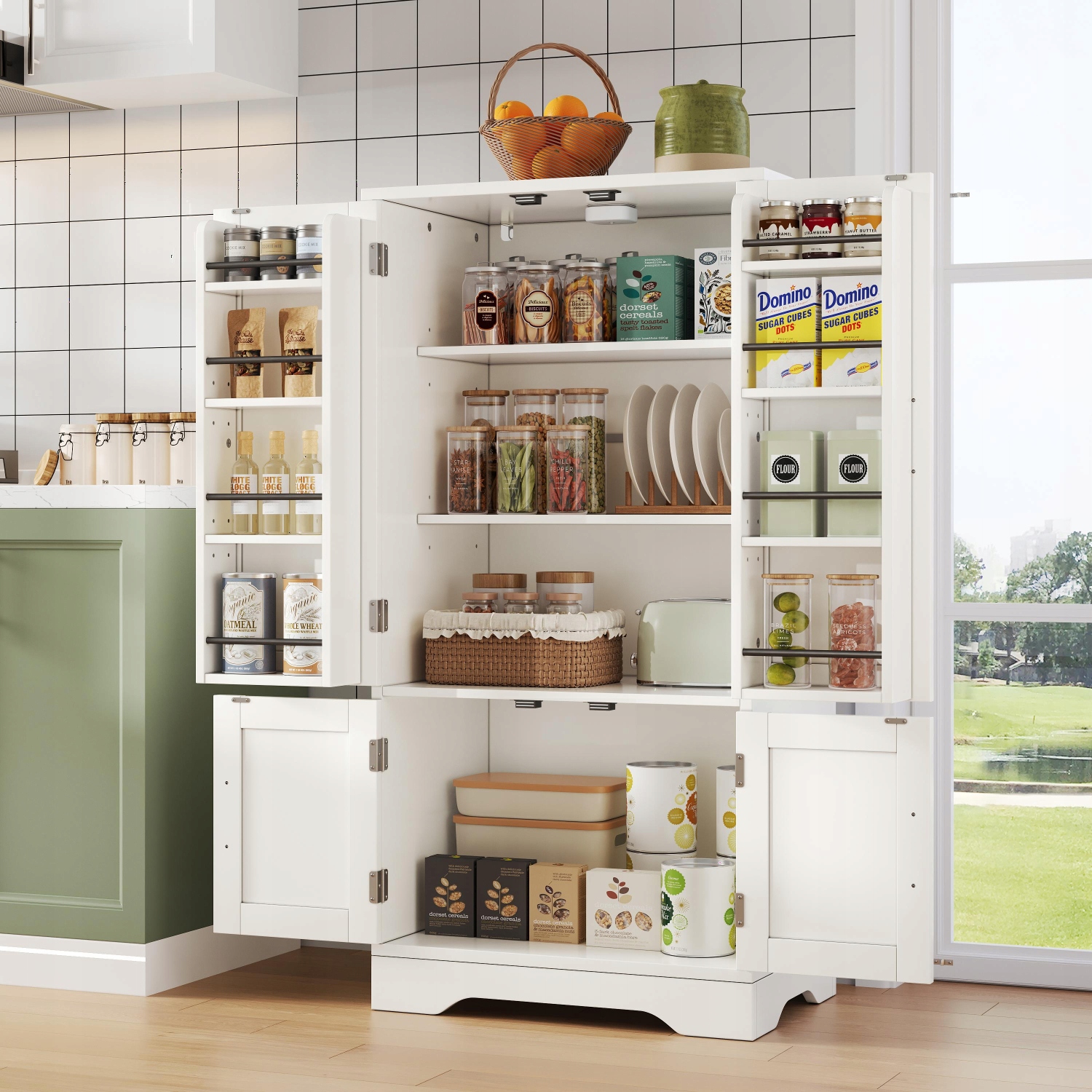- Верхній рівень оснащений двома регульованими полицями та регульованою дверною полицею, яку можна регулювати по висоті або знімати за потреби — ідеально підходить для зберігання їжі, столового посуду, спецій та інших дрібних предметів. Нижній рівень пропонує багато місця для зберігання, ідеально підходить для таких приладів, як мікрохвильова піч або кавоварка.