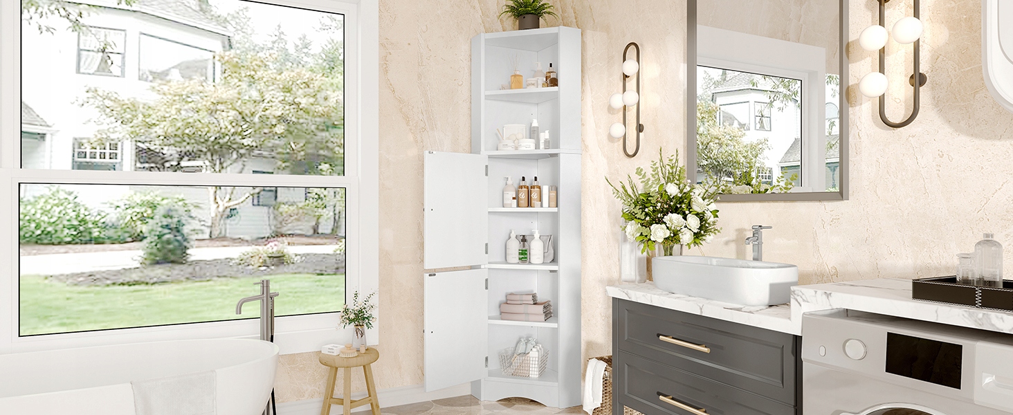 Достатньо місця для зберігання: цей шафа для ванної є ємновими місцями для зберігання вгорі та внизу та трьох зручних відсіків для зберігання всередині. Багатофункціональний дизайн відповідає різноманітним потребам зберігання. Висота перегородки може бути вільно відрегульована для ефективного використання простору. І пляшки, і косметика можна легко зберігати.