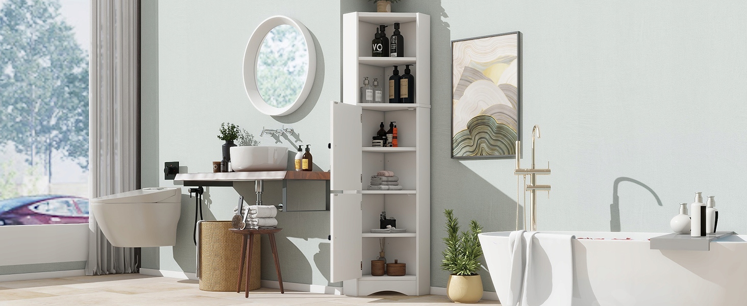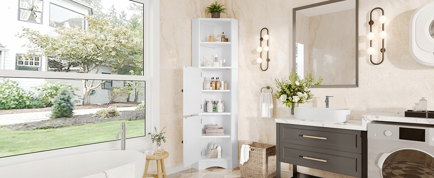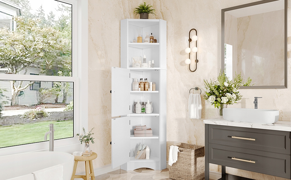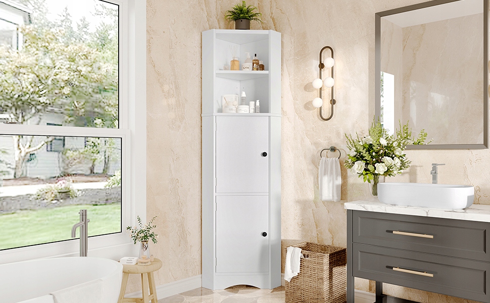 Цей шафа для ванної є подвійною гарантією краси та місця для зберігання у вашій ванній кімнаті! Він виготовлений з ретельно відібраного матеріалу MDF, який стійкий до вологи та довговічного, набагато краще, ніж делікатний шафа меламіну. Процес розпилення розпилювача надзвичайно ніжний, створюючи делікатний блиск, завдяки якому шафа світить приголомшливим сяйвом, як витвір мистецтва, негайно вдосконалюючи стиль ванної кімнати. Функція зберігання ще більш обширна: вгорі є два відкритих перегородків, а внизу дві ємності. Висота перегородки може бути плавно відрегульована, тому ви можете легко зберігати пляшки та банки, а також косметику, щоб ваша ванна кімната могла попрощатися з безладом. Унікальний, трикутний дизайн шафи економить простір, а також прекрасний і практичний. Виберіть, щоб ваша ванна кімната була і практичною, і красивою! Розміри продукту: