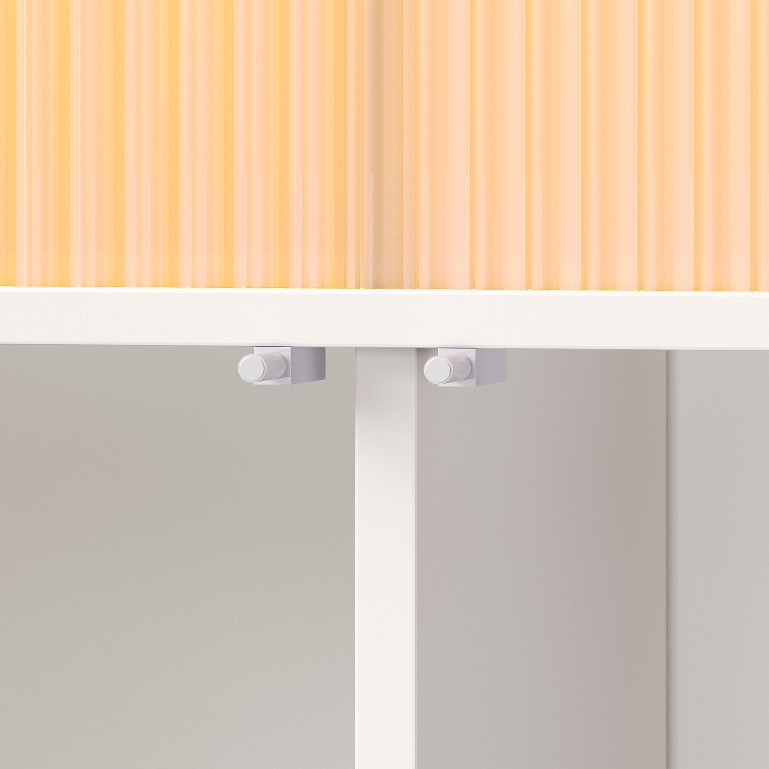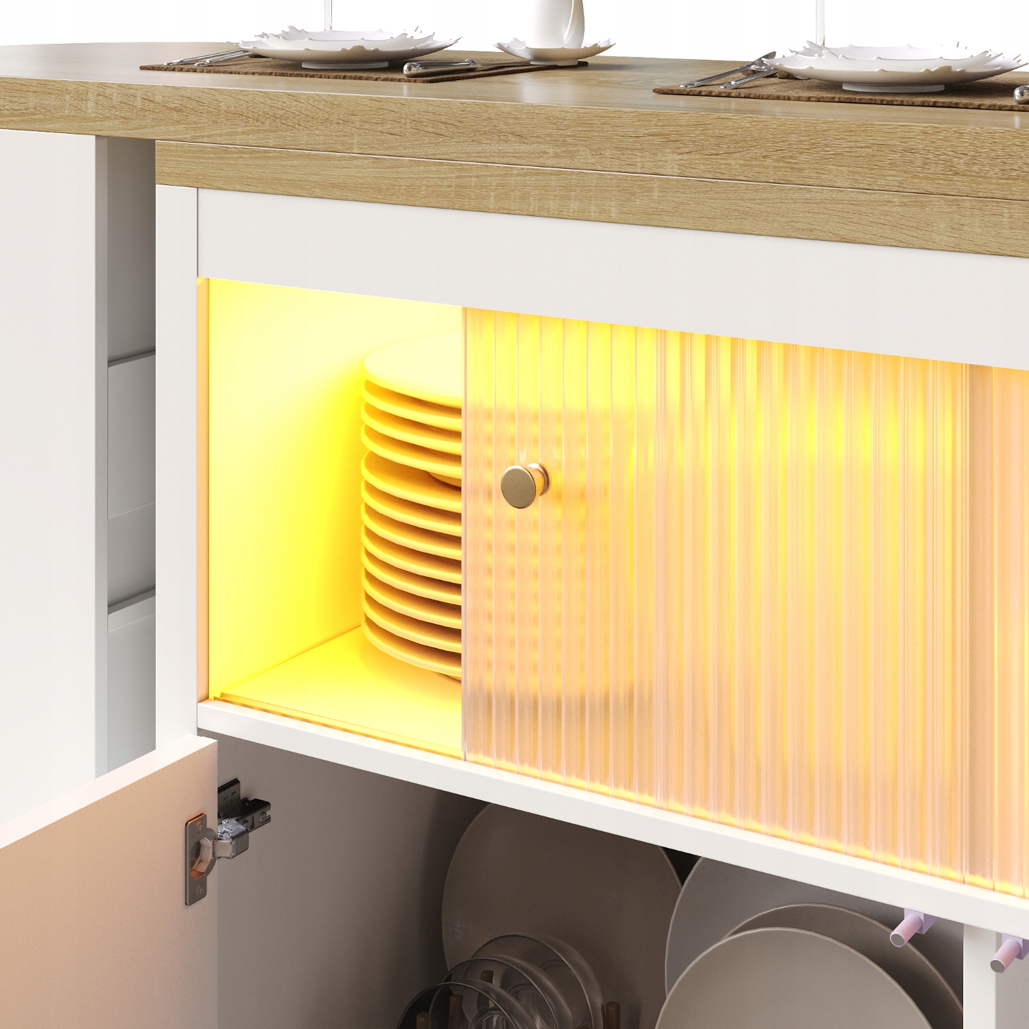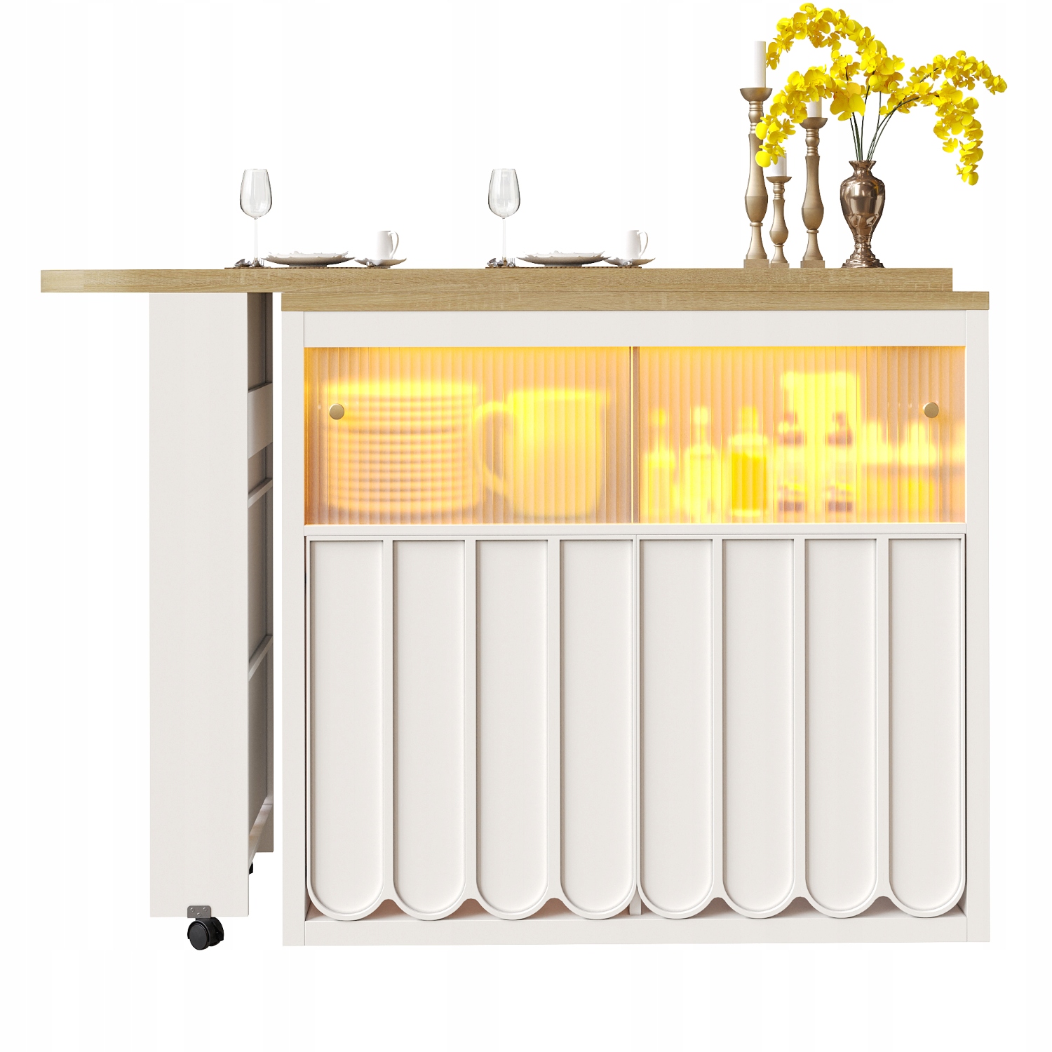 Білий розсувний барний стіл (високий кухонний острів) 135-205×39×100 см з відсіком – рухомий, телескопічний, зі світлодіодним підсвічуванням і смугастими дверцятами шафи.