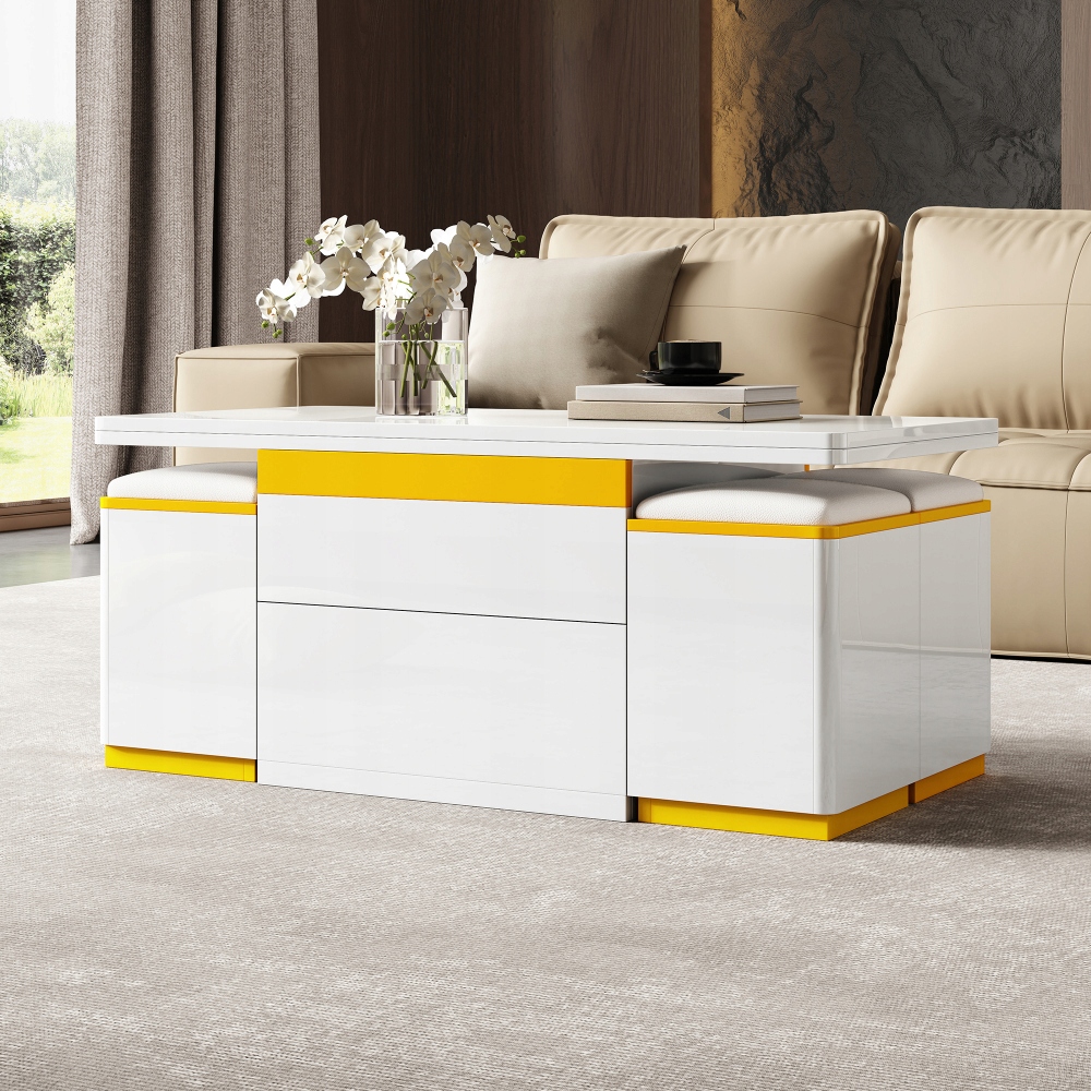 Цей багатофункціональний журнальний столик з регулюванням висоти поєднує в собі гнучкість у використанні простору з практичністю: регульована і складна верхня частина дозволяє швидко трансформувати журнальний столик в обідній або письмовий стіл - ідеально підходить для невеликих квартир. Вбудовані шафи мають ящики і відкриті полиці. У поєднанні з чотирма відповідними табуретами з відсіком він створює систему, що поєднує журнальний столик, сидіння та простір для зберігання, оптимізуючи використання простору. Чисті, біло-жовті лінії ідеально вписуються в сучасний стиль життя і гармоніюють з різними стилями інтер'єру, включаючи мінімалізм і індустріал. Завдяки компактній конструкції журнальний столик не потребує додаткових аксесуарів і розкладається, щоб дозволити сидіти багатьом людям. Це робить його ідеальним рішенням для маленьких віталень і квартир.
