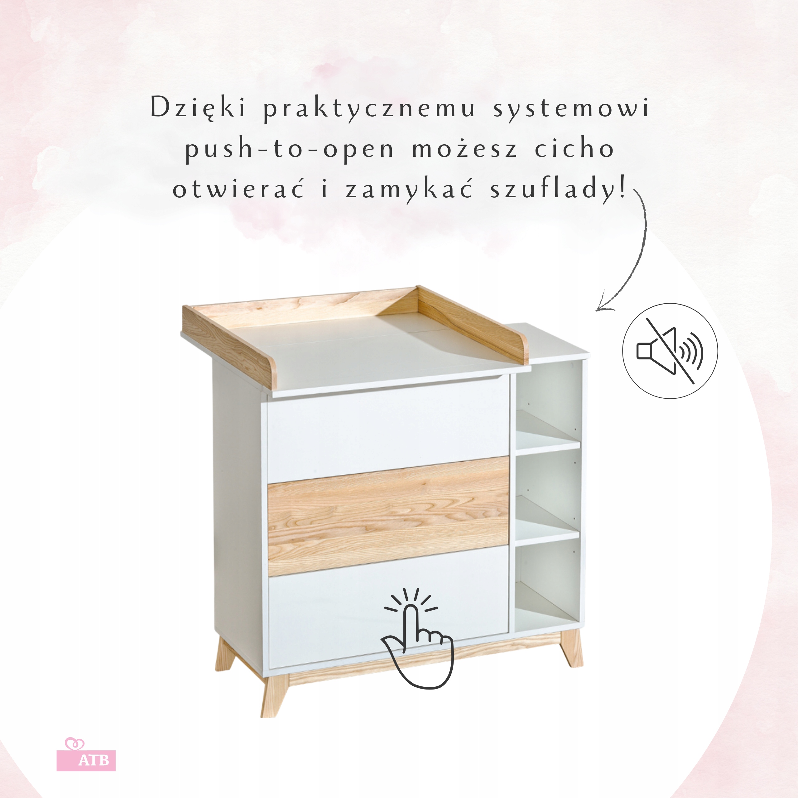 Білий комод з ящиками і пеленальним столиком NORDIK в скандинавському стилі з елементами дерева ясена це предмет меблів, розроблений з думкою про дітей і батьків. Це функціональний предмет меблів, який поєднує в собі практичні рішення та сучасний дизайн! ⭐