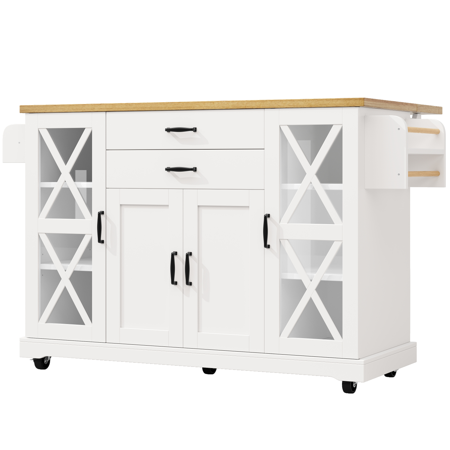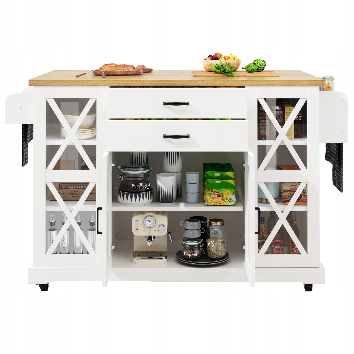Великий простір для зберігання: окрема чотиридверна шафа відповідає різноманітним потребам у зберіганні. Полиці, що регулюються по висоті, і додаткові відділення для зберігання всередині дверцят збільшують простір для вертикального зберігання. Дві великі висувні шухляди в передній частині візка для сервірування оптимізують зберігання повсякденних речей.