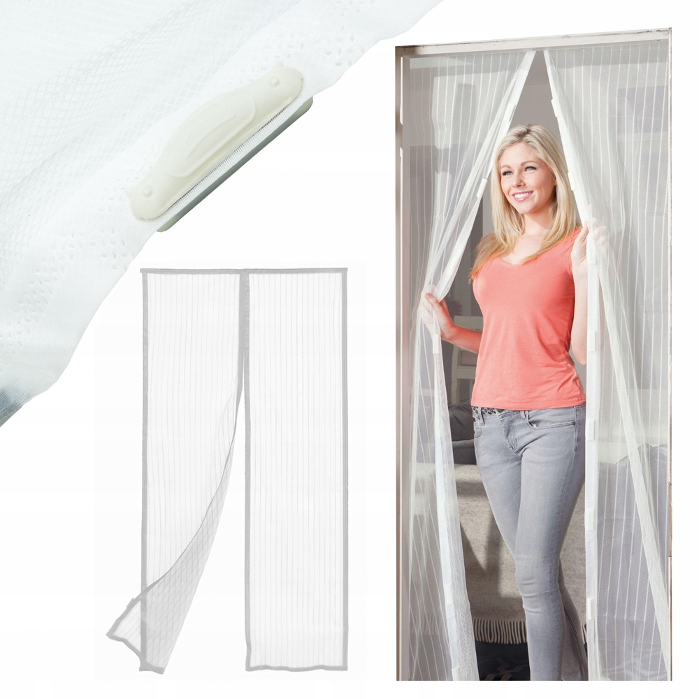 Москот -магнітного магнітного макітіє - два ремені. Завіса складається з двох білих сітчастих ременів з магнітними ременами, встановленими в краях ( 8 кубів магнітних і 7 штук магнітних смужок )- виходячи через завісу, що ми просуваємо ремінці, які потім після проходження "автоматично" ковзають позаду нас, використовуючи кімнату. Підходить до дверей максимум 120 см x 230 см .
