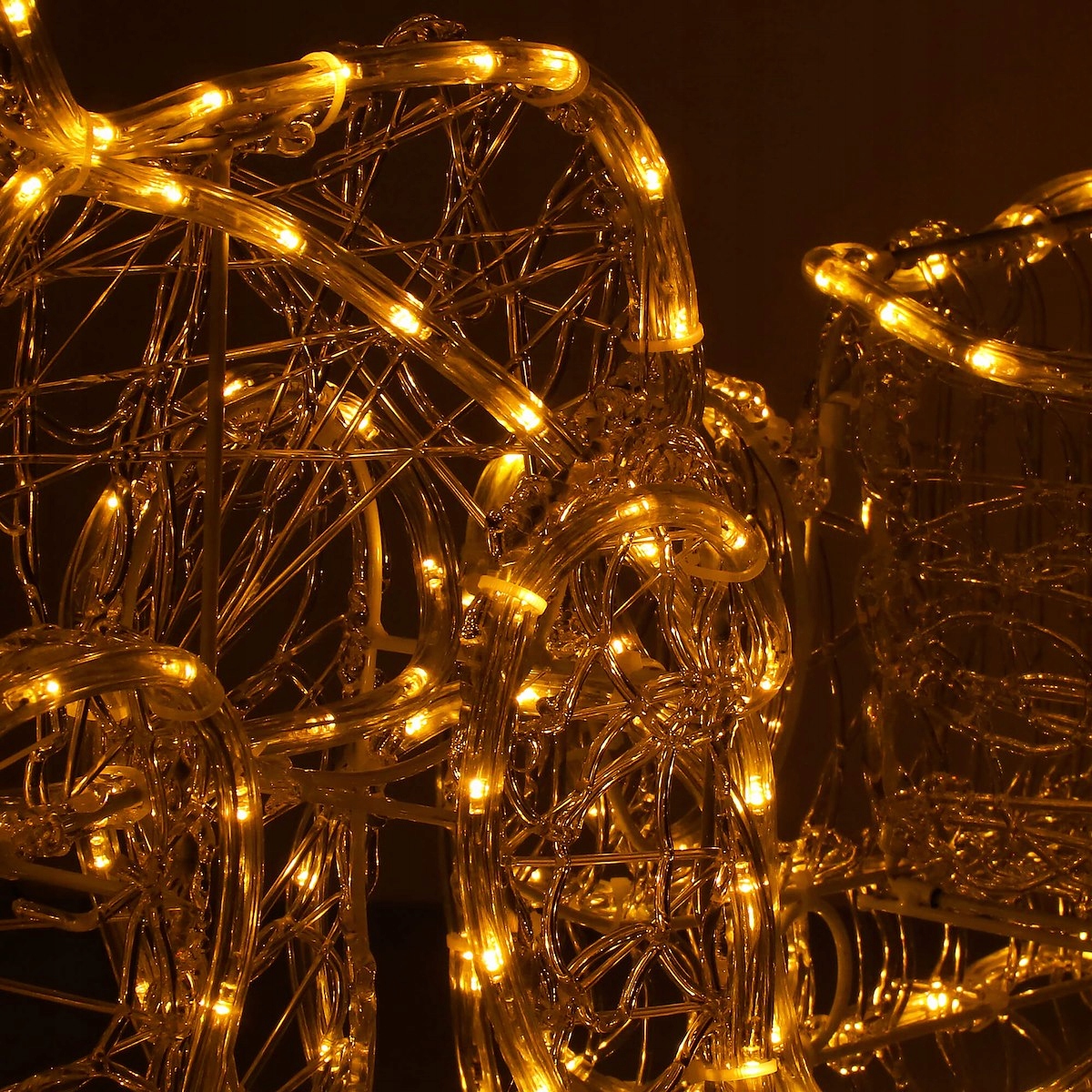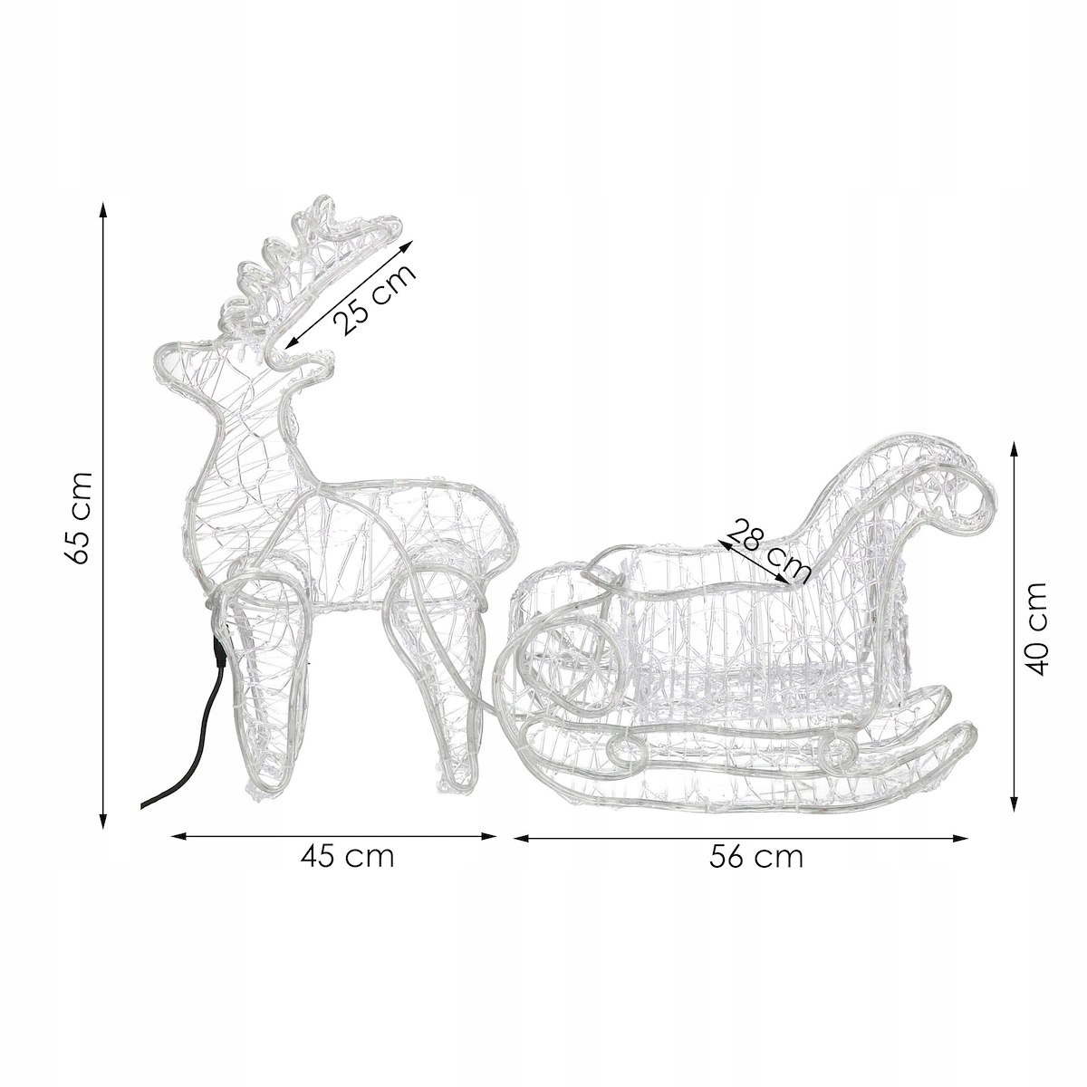 Міцна, гнучка кришка легкого ланцюга має товщину майже 9 мм і має клас IP44 це параметр, який вказує на те, що ви можете легко розмістити світлодіодних оленів як всередині, так і зовні будинку - в саду, на терасі, балконі. У набір також входять металеві кілочки, за допомогою яких можна прикріпити оленя і сани до землі. Стійка металева конструкція, забезпечує постійну форму інсталяції.