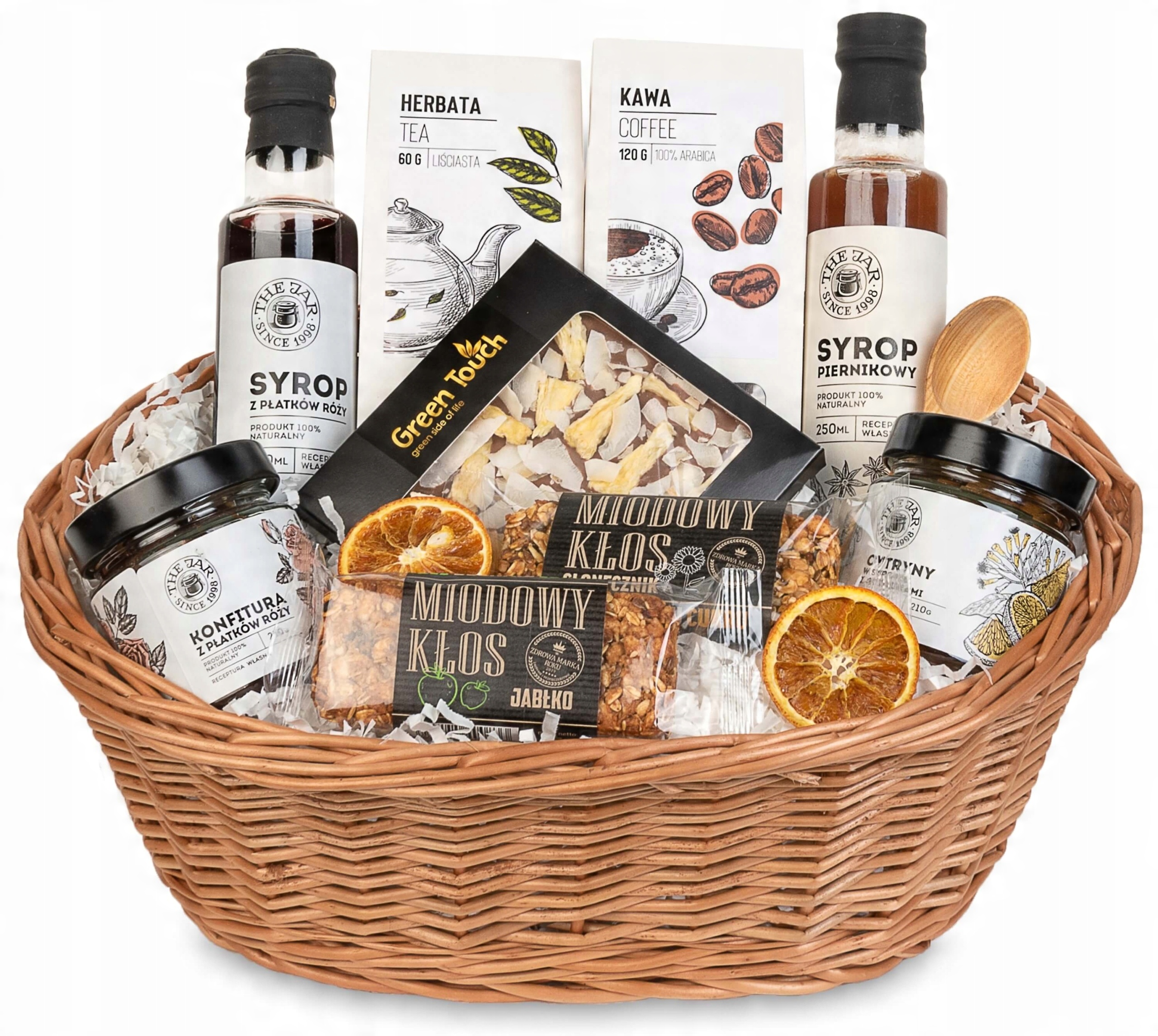 Наш подарунковий кошик поєднує найкращі кавові зерна з ароматним чорним чаєм Green Touch. Ми додаємо ексклюзивні сиропи та джеми з пелюсток троянд, медові батончики та справжній домашній шоколад. Красу кошика доповнюють сушені апельсини та дерев'яна ложка - ідеальний подарунок для гурманів.