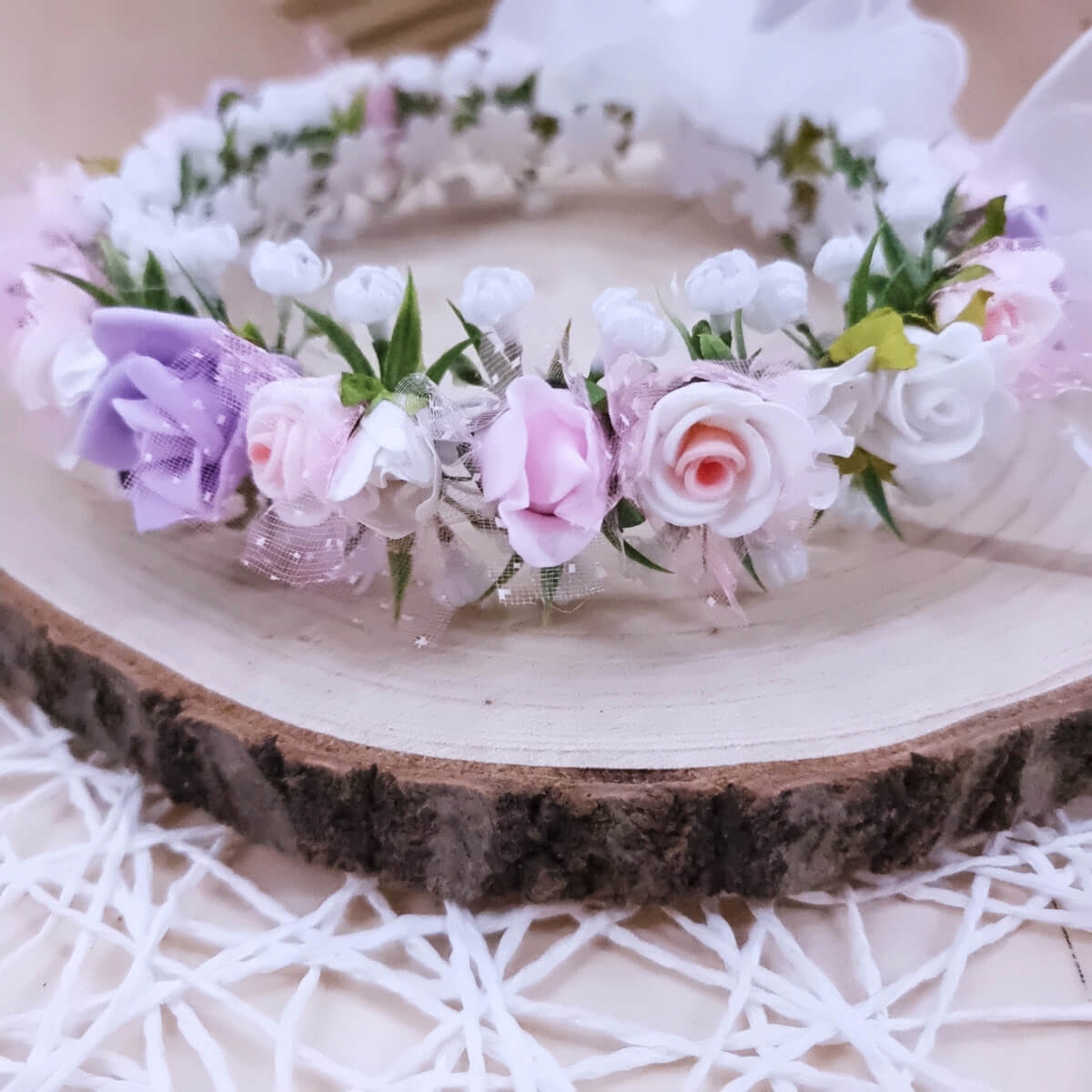 Прекрасний причастяний вінок з білими рожевими та фіолетовими трояндами ручної роботи з регулюванням на периметрі