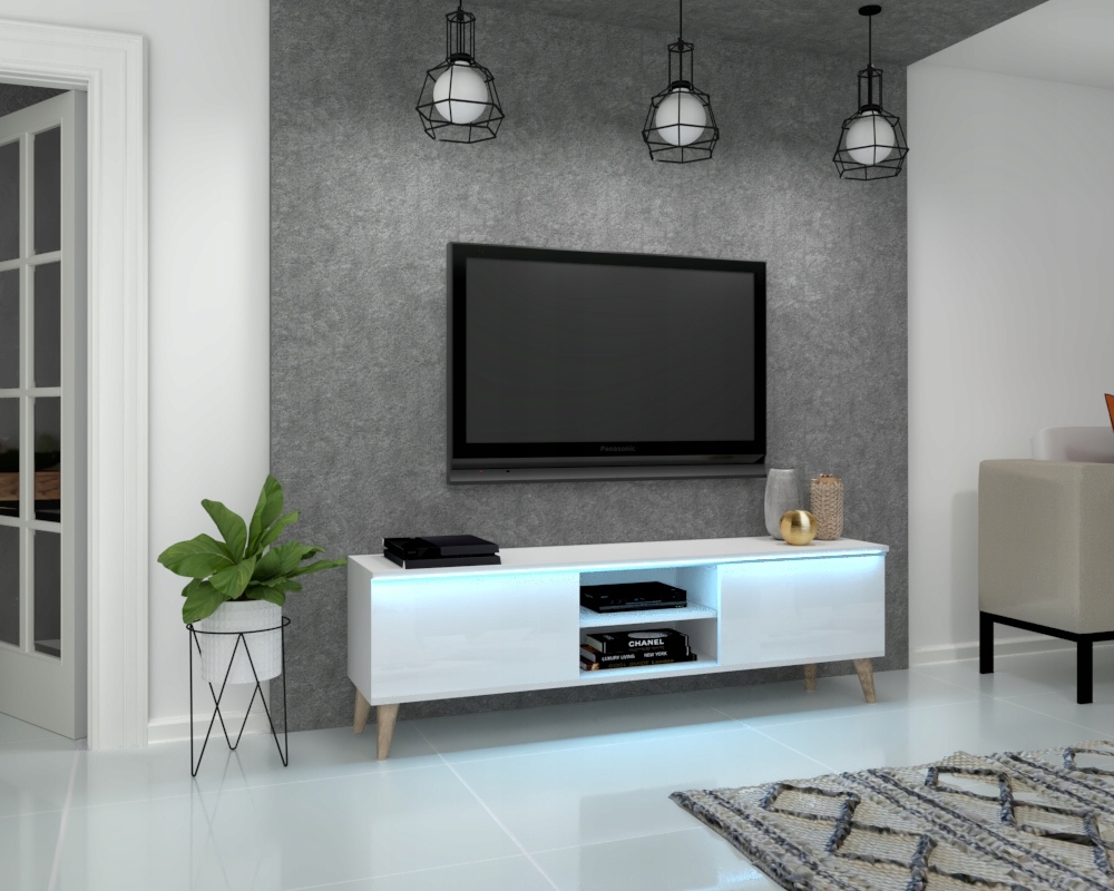 Сучасна тумба під ТВ KING SKANDI в скандинавському стилі на похилих ніжках + LED підсвічування