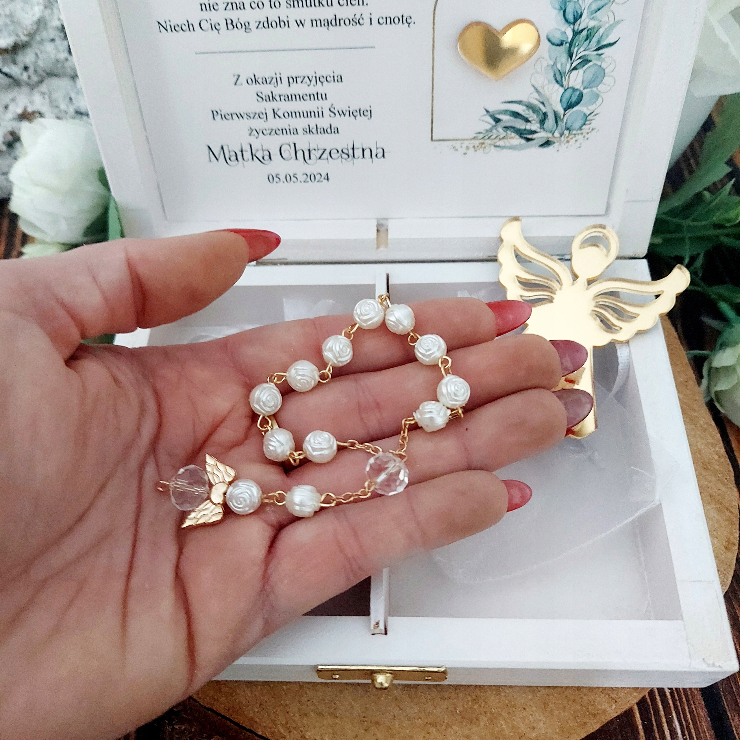 Білий сувенір святого спілкування з розарієм та набором ангелів