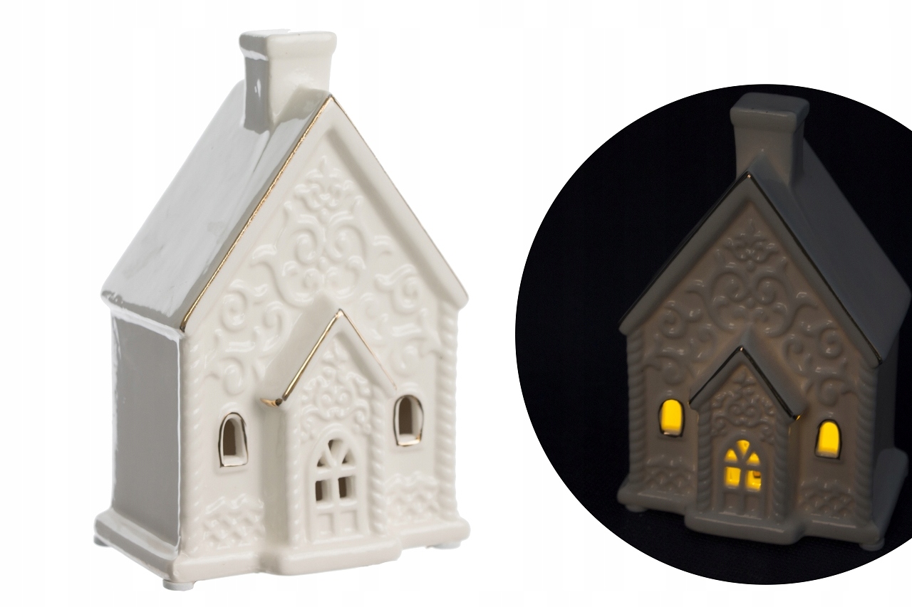 Керамічний будинок зі світлодіодним підсвічуванням, білий з золотими елементами, Виріб виконано естетично, що робить його унікальною прикрасою. Дозволяє створити затишну атмосферу вдома.