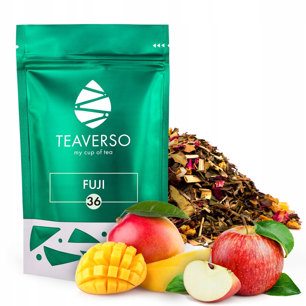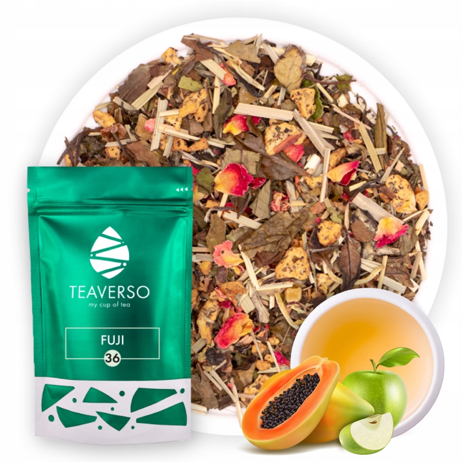 Білий чай Fuji з добавками - це композиція сорту пай мутан і сушеного яблука, цукатів манго, лемонграсу, пелюсток троянд і м'яти.