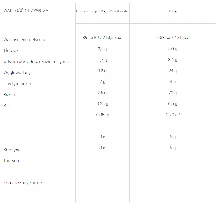 Інгредієнти: Концентрат сироваткового білка (з молока) 70%, мальтодекстрин, креатин моногідрат, таурин, ароматизатори, какао 1% (смак шоколаду), концентрований порошок полуничного соку 0,1% (аромат полуниця), ваніль мелена 0,1% (аромат ванілі), жир молочний (аромат помадка), регулятор кислотності: лимонна кислота (аромат полуниці), загущувач: ксантанова камедь, підсолоджувачі: ацесульфам К та сукралоза, барвники: аміачна карамель (ароматизатори: шоколад, солена карамель, помадка), кармін (аромат полуниці), каротини (ароматизатори: солона карамель, помадка), сіль (аромат солоної карамелі).