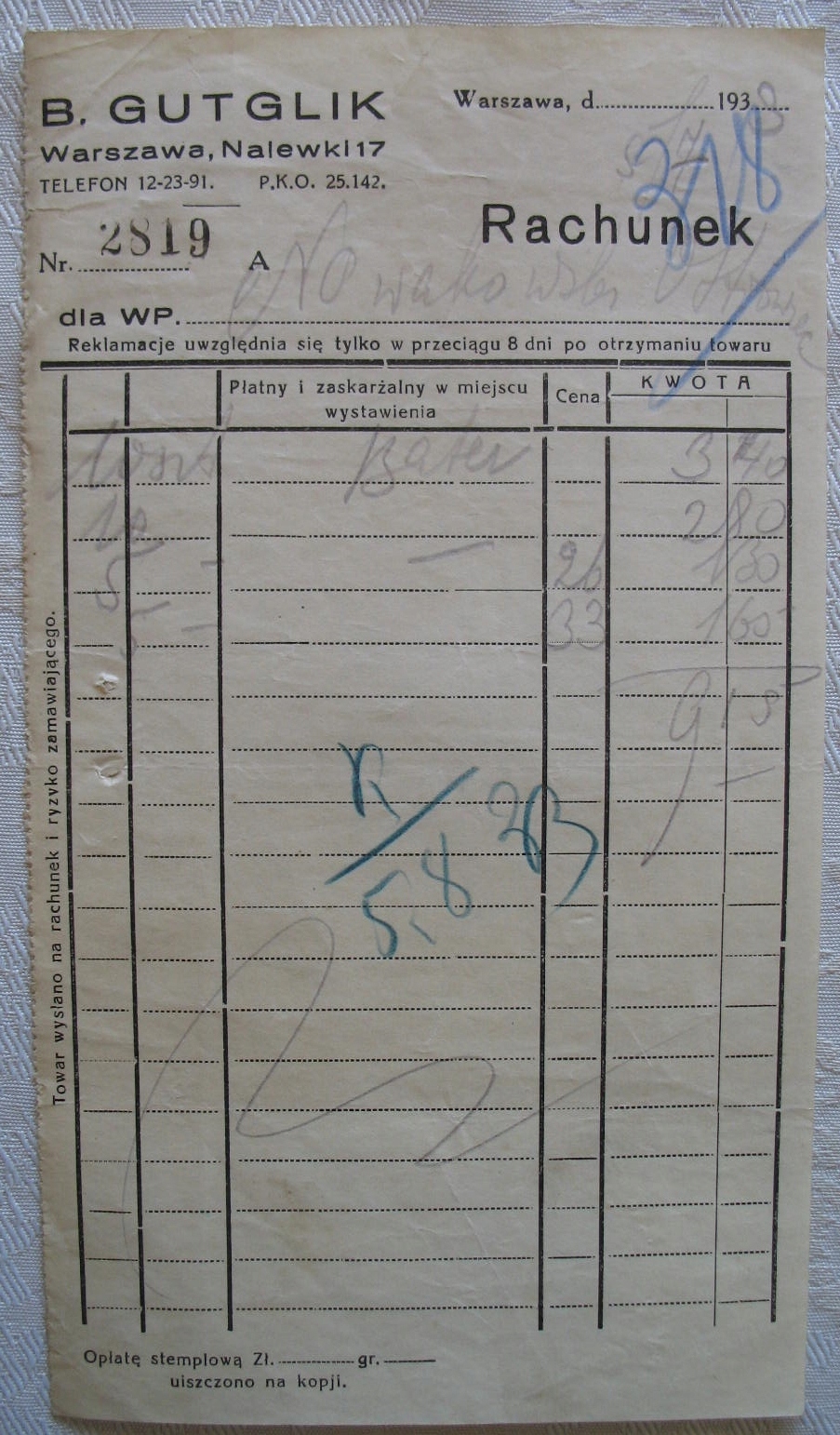 Оплачивая «Билл Б. ГУТГЛИК, Варшава, 1933 г.», вы можете быть уверены, что данное изделие из каталога «Счета-фактуры и счета» будет доставлено из Польши и проверено на целостность. В цене товара, указанной на сайте, учтена доставка из Польши. Внимание!!! Товары для Евросоюза, согласно законодательству стран Евросоюза, могут отличаться упаковкой или наполнением.