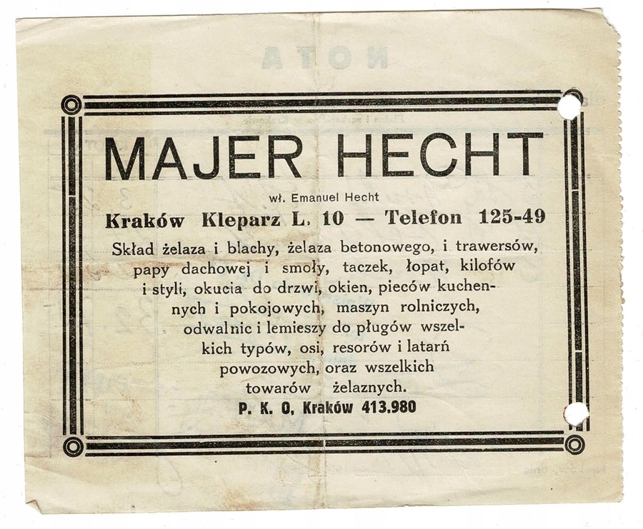 BILL NOTA MAJER HECHT KRAKÓW KLEPARZ 10 PIEC PAPA РЕКЛАМА 1938 JUDAICA