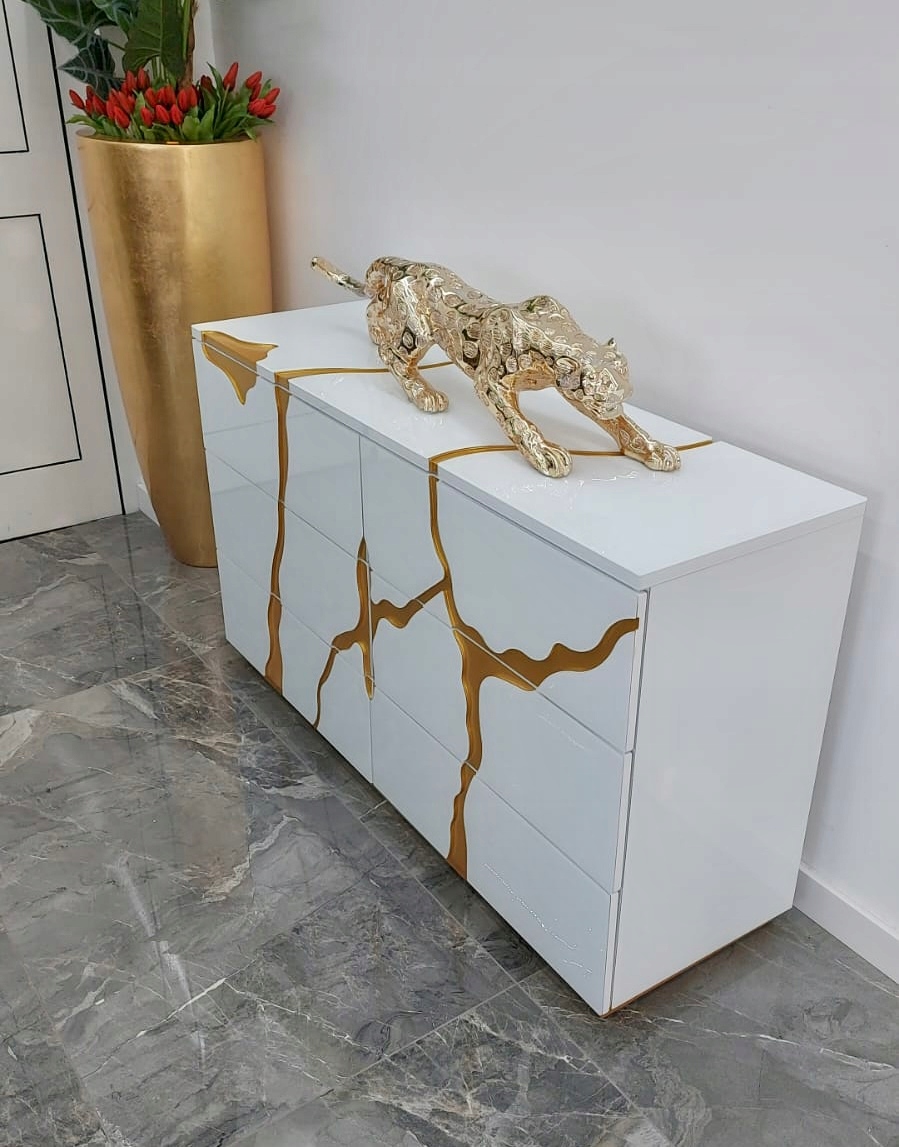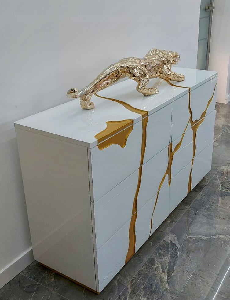 Комод New York Antonio вирізняється ефектним дизайном. Білі скляні фасади в золотому поєднанні виглядають унікально! Місткі ящики всередині. Він зроблений таким чином, що вражає своєю елегантністю і водночас створює дивовижний візуальний ефект. Підійде до будь-якого сучасного інтер'єру. Ідеально підходить для вітальні, холу, спальні або офісу. WOW-ефект гарантований!