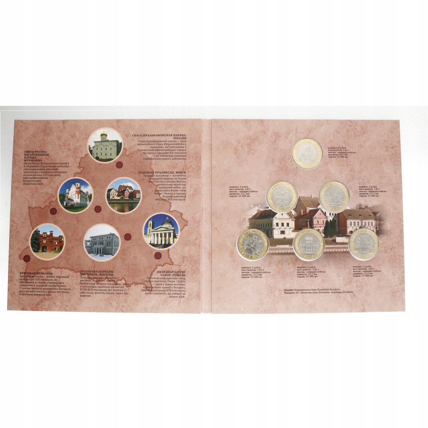 Набір пам'ятних монет із серії «ПАМ'ЯТКИ АРХІТЕКТУРИ БІЛОРУСІ», що складається з 6 біметалевих монет