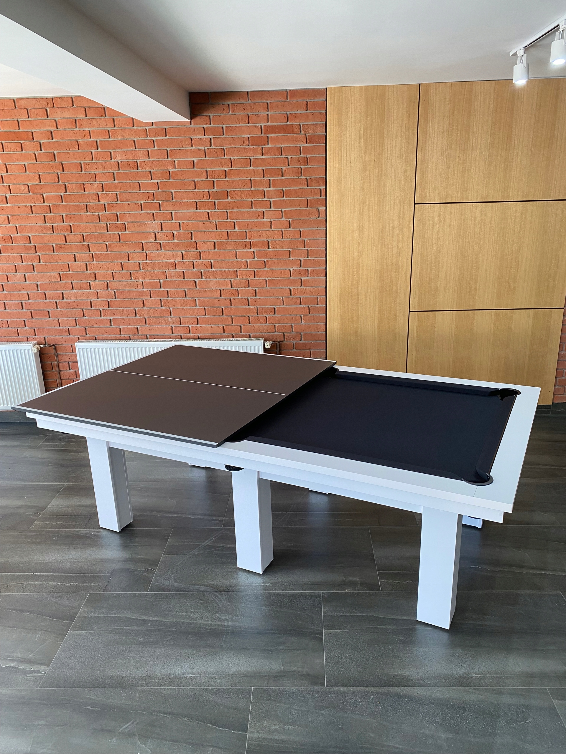 виготовлена з ламінованої дошки, складається з двох частин, яка служить стільницею для банкетів і конференцій і може вмістити приблизно до 14 осіб.