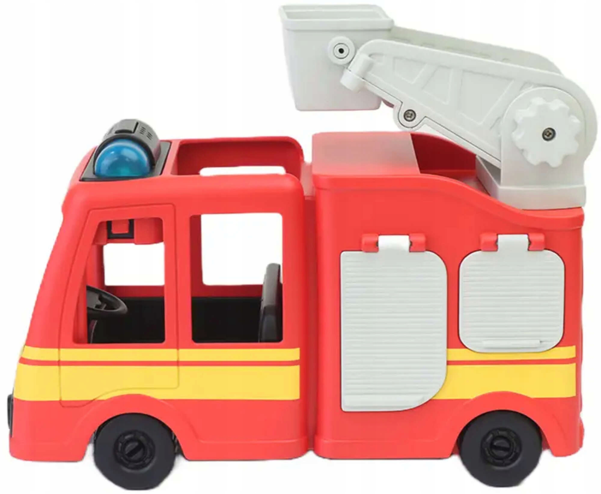 пожежна бригада в червоних кольорах з жовтою смугою збоку і з білими елементами . На задній частині автомобіля є рухома драбина , яку можна підняти , і ми можемо покласти зайчика статуетки . Нижче ми знаходимо 4 сірі клаптики для відкриття , під якими ми помітимо наклейки з зображеннями рятувальних інструментів для пожежників. На передній частині охоронця ми маємо великий кабіна, , де також є місце для фігурки невеликий зайчик прямо за кермом транспортного засобу. Однак на даху автомобіля була встановлена сирена з кнопкою та динаміками . Натиснувши кнопку, ми помітимо сирени червоного та синього кольору та почуємо гучний звук сирени тривоги, типовий для пожежної бригади.