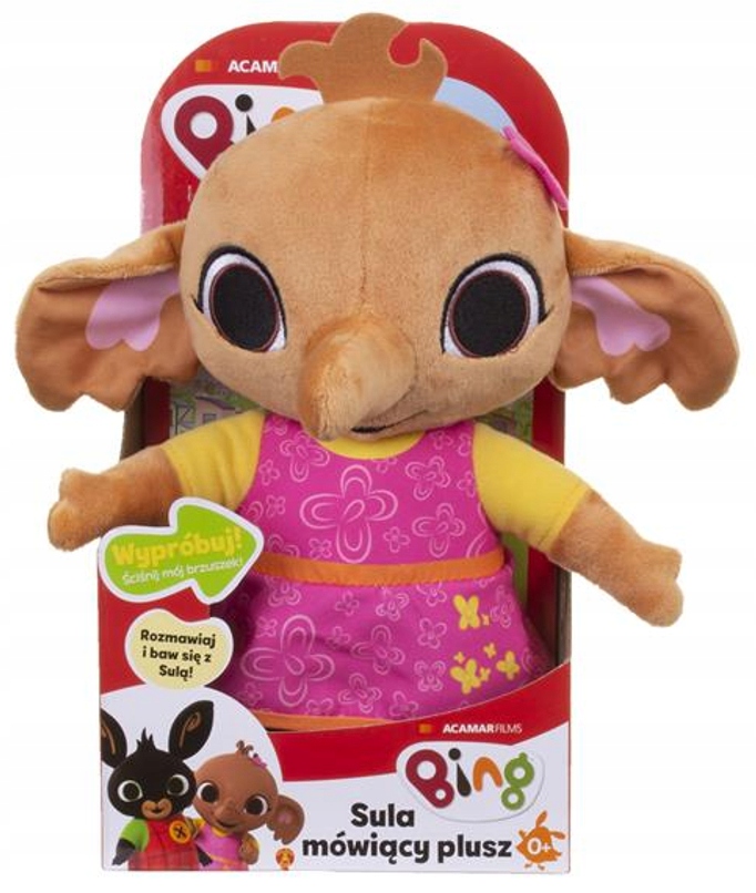 Приємний на дотик інтерактивний талісман із зображенням слона Сула - героїня казки про пригоди зайчика Бінга! Казки, і його улюблений - це серія про пригоди кролика Бінга - це інтерактивний талісман, який він, безумовно, сподобається з першого погляду. Іграшка представляє Сулу - слон, який є найкращим другом головного героя казки. Плюшева тварина радує як молодших, так і старших дітей своїм зовнішнім виглядом та смішними звуками.