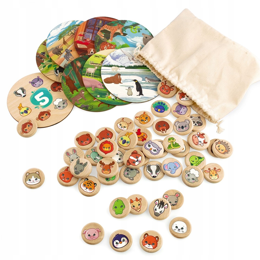 desková hra pro děti dřevěné kartičky (každá o velikosti 4x4 см) s Zbrázky pro hru na posílení paměti a slovní zásobu. Kresba - dřevotisk. Počet kartiček v sadě- 48 kusů a 8 kartiček + sáček.
