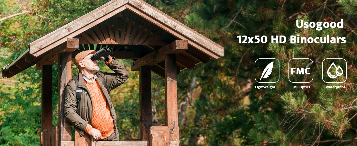 Бінокль Usogood 12x50 забезпечує поле зору 374 фути на 1000 ярдів, що ширше, ніж біноклі 12x25, 10x25, 20x50. Найближча відстань огляду 2,5 метра дозволяє спостерігати за природою зблизька без розмиття. Ідеально підходить для спостереження за птахами, полювання, концертів і спортивних заходів.