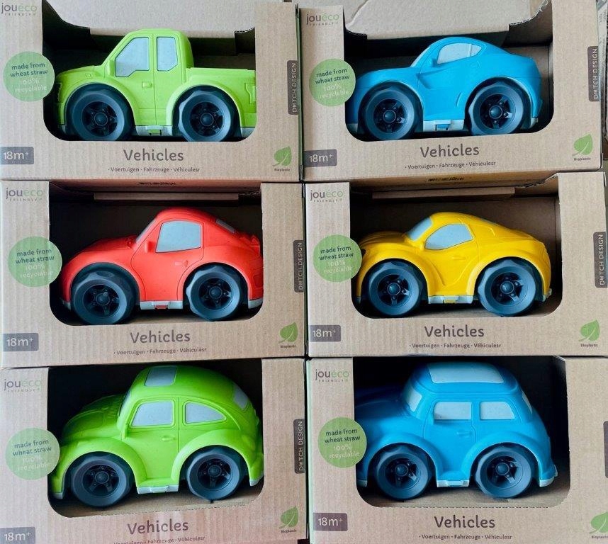 Автомобілі BIO Joueco виготовлені з біопластику за новітньою технологією з переробленої пшеничної соломи. Вони були розроблені, щоб зменшити викиди вуглекислого газу та дбати про навколишнє середовище. Дрібні коричневі точки характерні для іграшок з додаванням пшеничної соломи. Автомобілі легкі та дуже добре зроблені, маневрені та прості в управлінні. Вони не мають гострих країв, ідеально підходять для маленьких ручок.
