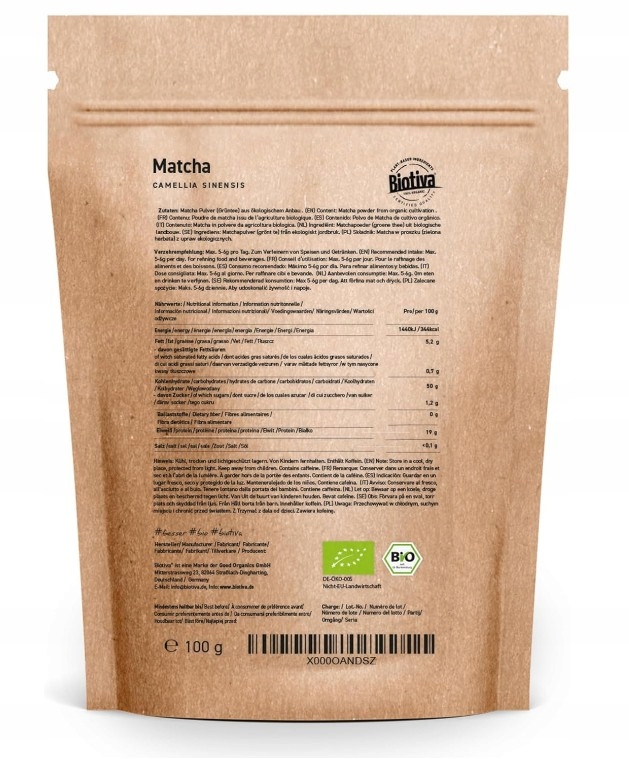 Biotiva Matcha просто чудово смакує: як Matcha Tea, Matcha Latte, у рецептах випічки, таких як Matcha Cake або в зеленому коктейлі. Морозиво Matcha, печиво Matcha, Musli з Matcha: Смакуйте добре у будь -якій ситуації! На відміну від зеленого чаю, у випадку з матчі вживається весь порошок матчі. У виробничому процесі листя повільно заземлюються, щоб бути дуже добре з гранітною шліфувальною машиною. Через пероральне споживання всього порошку вміст поглинання поживних речовин у десять разів більший, ніж у випадку інфузії зеленого чаю.