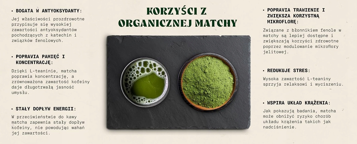 попередження самурая перед експедицією Piili Matcha як природного енергетичного агента. Кубок Matcha містить половину кофеїну, ніж чашка кави, але ефект її дії, завдяки L-eanin, може залишитися набагато довше. Матча стимулює та полегшує концентрацію, але не викликає розведення, що іноді викликає каву. У свою чергу, катехіни, що містяться в чаю, мають антибіотичні властивості та зміцнюють імунну систему.