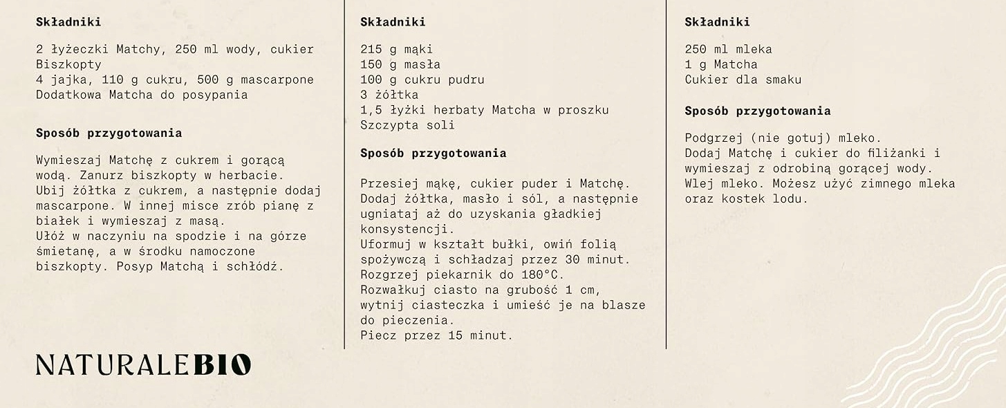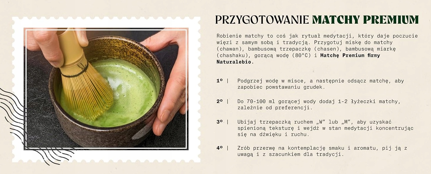 Традиційний метод підготовки чаю матчі походить з японської чайної церемонії. Вам потрібен Czarek Matchanan, бамбуковий збиток і бамбукова чайна ложка Чашака. Вилийте дві бамбукові чайні ложки матчі (1,5 г) у чашку, налийте 100 мл гарячої води (80 ° C) і інтенсивно перемішайте. Зробіть рухи, що нагадують букву m до створення зеленої товстої піни. Це займає менше 30 секунд. Потім додайте більше води залежно від того, наскільки сильним ви любите пити чай.
