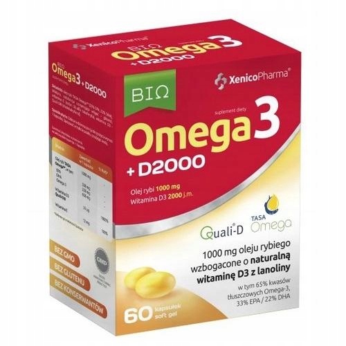 Bio Omega3 + D2000 - це високоякісна дієтична добавка, що містить 1000 мг (включаючи 65% Омега-3) концентрованої перуанської холодноводної риби олії в одній капсулі (ТАСА ОмегаTM). Це також джерело природного вітаміну D3, отриманого з ланоліну (Quali0-D®). Вітамін D3, що міститься в препараті, розчинений у природних жирах, завдяки чому він найкраще засвоюється організмом. Препарат доповнює раціон незамінними Омега-3 жирними кислотами, включаючи 33% EPA (ейкозапентаєнової кислоти) і 22% DHA (докозагексаєнової кислоти), які сприяють правильній роботі серця.