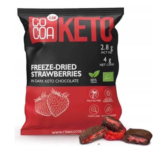 Біо полуниця, висушена в сирому кето -шоколаді без цукру 40 г від какао -це унікальна закуска, що поєднує натуральну солодкість полуниці, що висушила заморожування, з інтенсивним смаком сирого темного шоколаду. Цей продукт є повністю екологічним, без додавання цукру, що робить його ідеальним вибором для людей на кетогенній дієті, діабетиків та всіх тих, хто піклується про здорову дієту. Завдяки використанню еритритолу як підсолоджувача, закуска зберігає солодкий смак, не впливаючи на глюкозу в крові.
