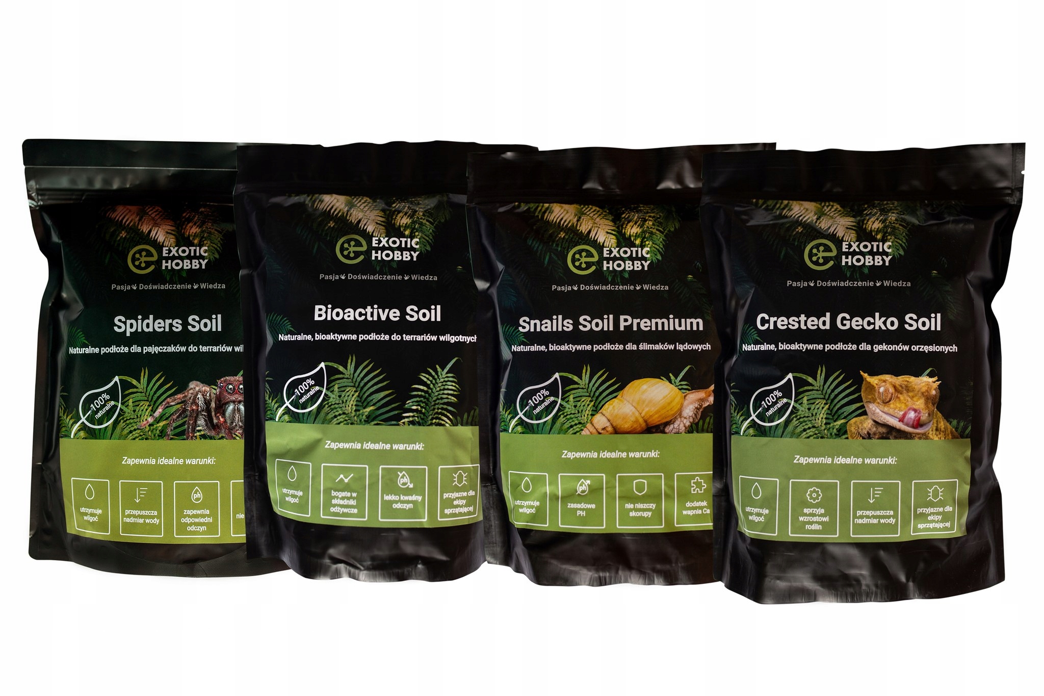 Пропозиція компанії включає біоактивні субстрати, що складаються з 100% природних інгредієнтів: ґрунтового ґрунту ґрунту (ґрунтовий ґрунт Geckos), ґрунтові равлики та підкладка для павутин для вологих тераріумів (ґрунт павуків). Доступно в нашій пропозиції.