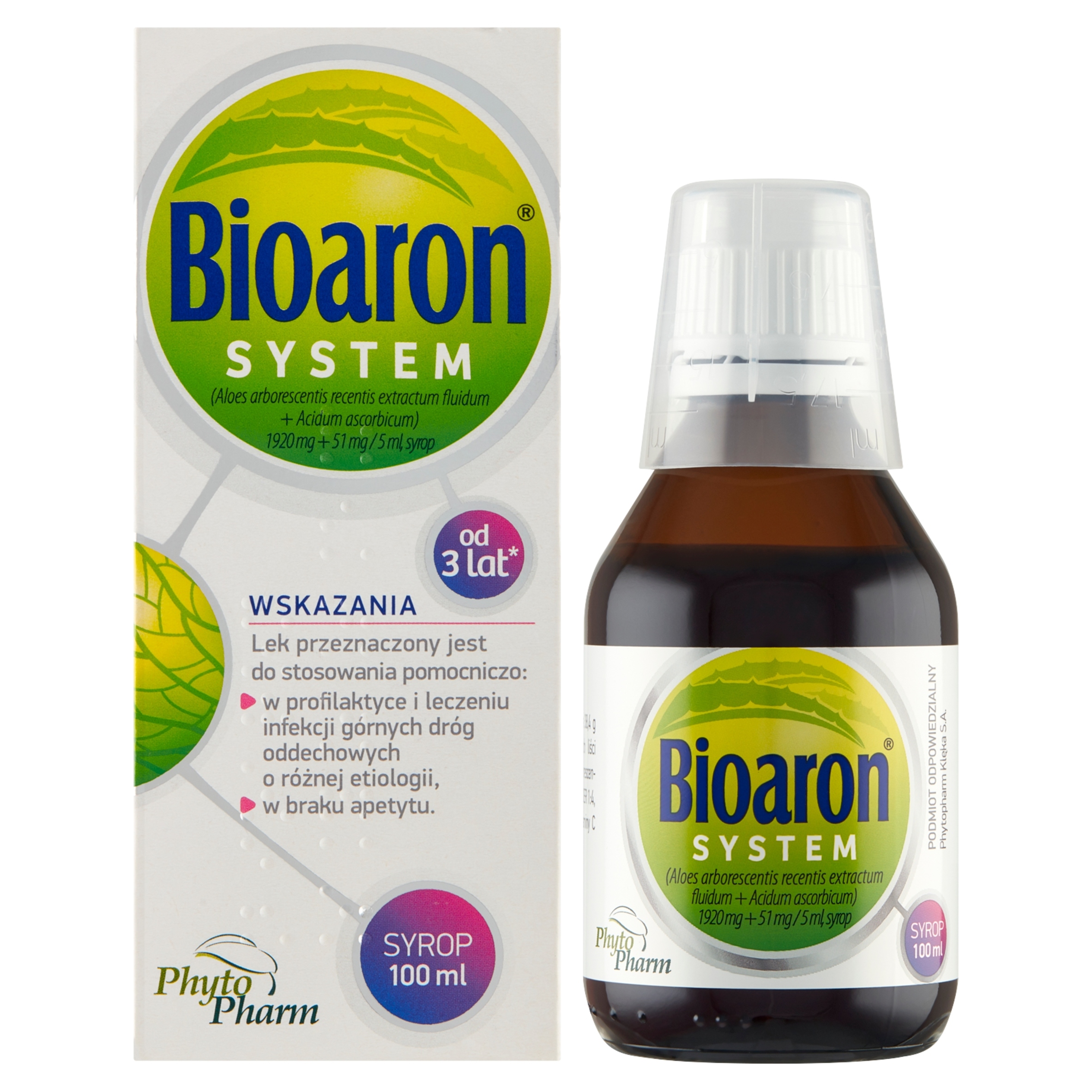 Застосування сиропу Bioaron® System стимулює імунну систему завдяки речовинам, які містяться в екстракті листя алое деревного. Встановлено, що препарат впливає як на гуморальну, так і на клітинну відповідь, викликає збільшення кількості В- і Т-лімфоцитів і кількості антитіл, що циркулюють у крові, внаслідок чого відновлюється нормальна відповідь імунної системи. Стимуляція ослабленого імунітету організму полегшує боротьбу з бактеріальними та вірусними інфекціями. Крім того, сироп Bioaron® System містить вітамін С і сік чорноплідної горобини, який також є джерелом вітамінів і мінералів. Препарат призначений для дітей. Під час досліджень переносимості застосування сиропу Біоарон® Систем у дітей було встановлено, що препарат також стимулює апетит.